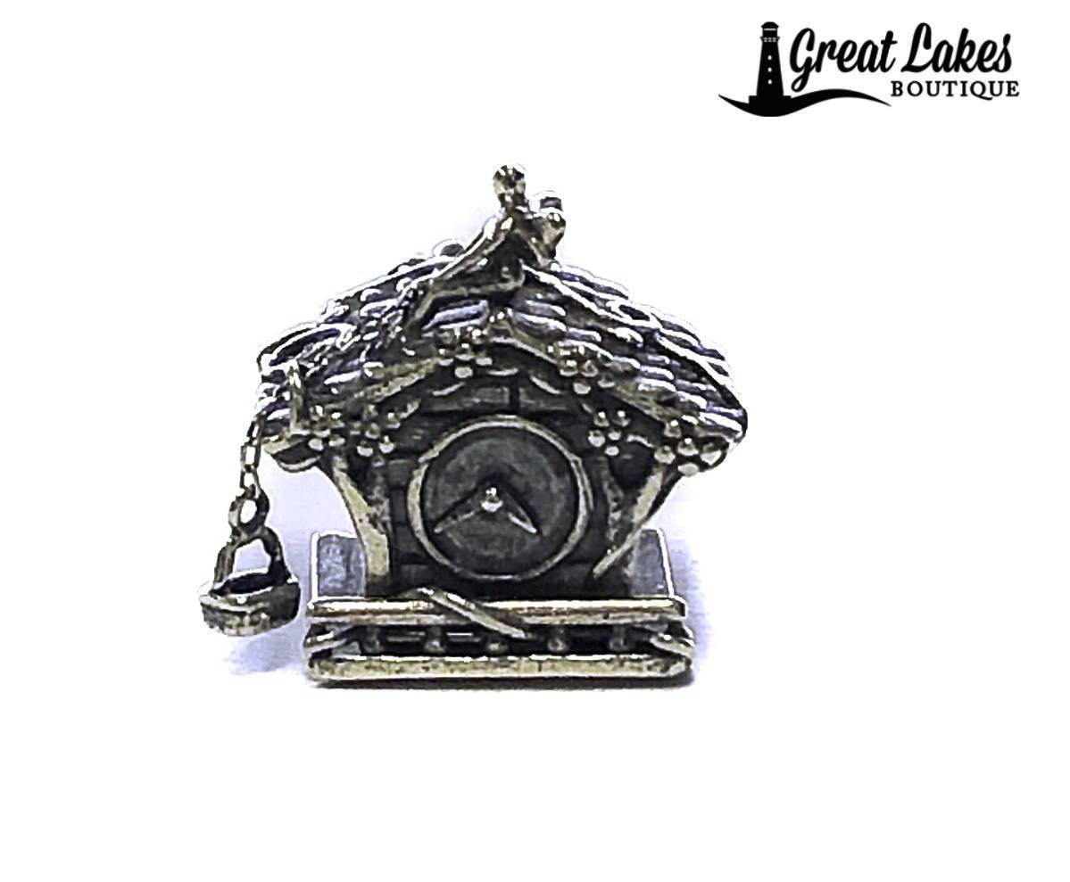This bead depicts a clock in the style of a tree house with a fairy sat on the roof hauling a small basket attached to a chain.
