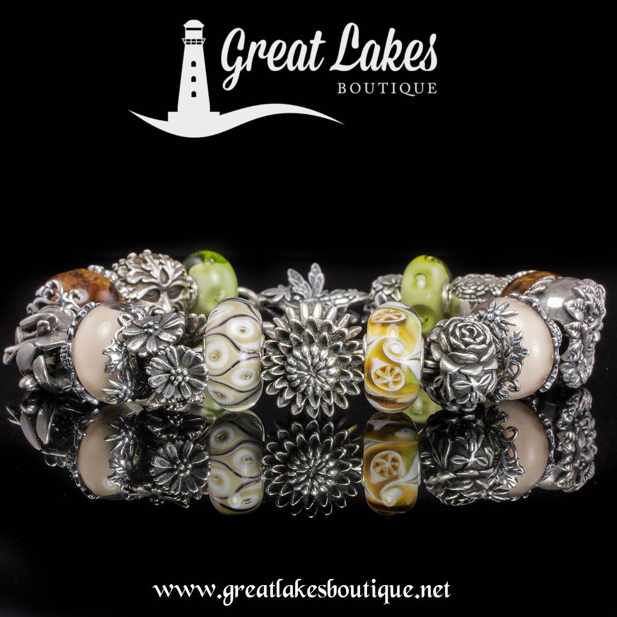 The focal silver here is the Redbalifrog Chrysanthemum. It's not a new bead and actually none of the silvers here are but it's striking and still a consistent seller. To the left of the center is the Redbalifrog Daisy Chain and to the right is Roses, (also available in brass for those of you who prefer warmer tones.)