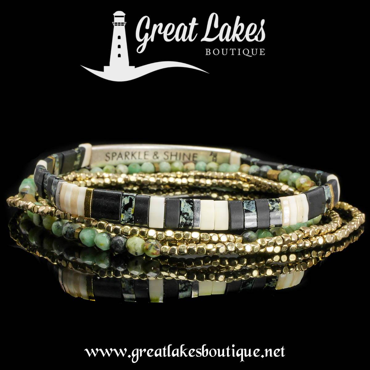 Scout is designed for layering and mixing and matching. Pictured here is one of my favorite combinations right now. It features the Scout Curated Wears Good Karma Miyuki Bracelets Sparkle & Shine in Raven & Silver, layered with a Delicate Stone Wrap with African Turquoise.