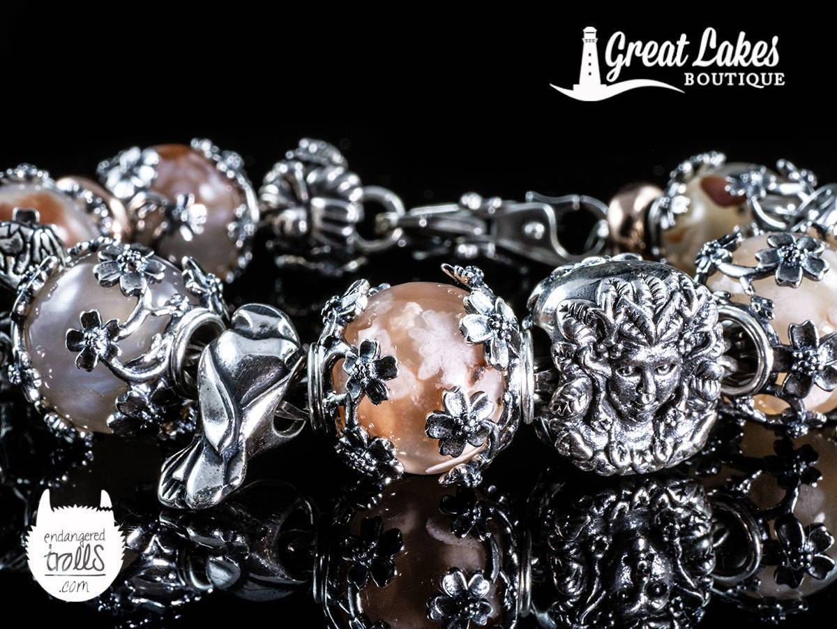 I couldn't wait to try bracelet combinations for this bead. Though it is a chunky, focal piece in it's own right, I've fallen in love with several on the same bracelet. This combination uses spring inspired silver beads, many of which have a very strong feminine vibe. The exclusive Redbalifrog Green Goddess also takes a lead role and her decorative foliage complements the Flamboyant Sakura perfectly. She'll be available during Bead Bash on the Lake next weekend also.