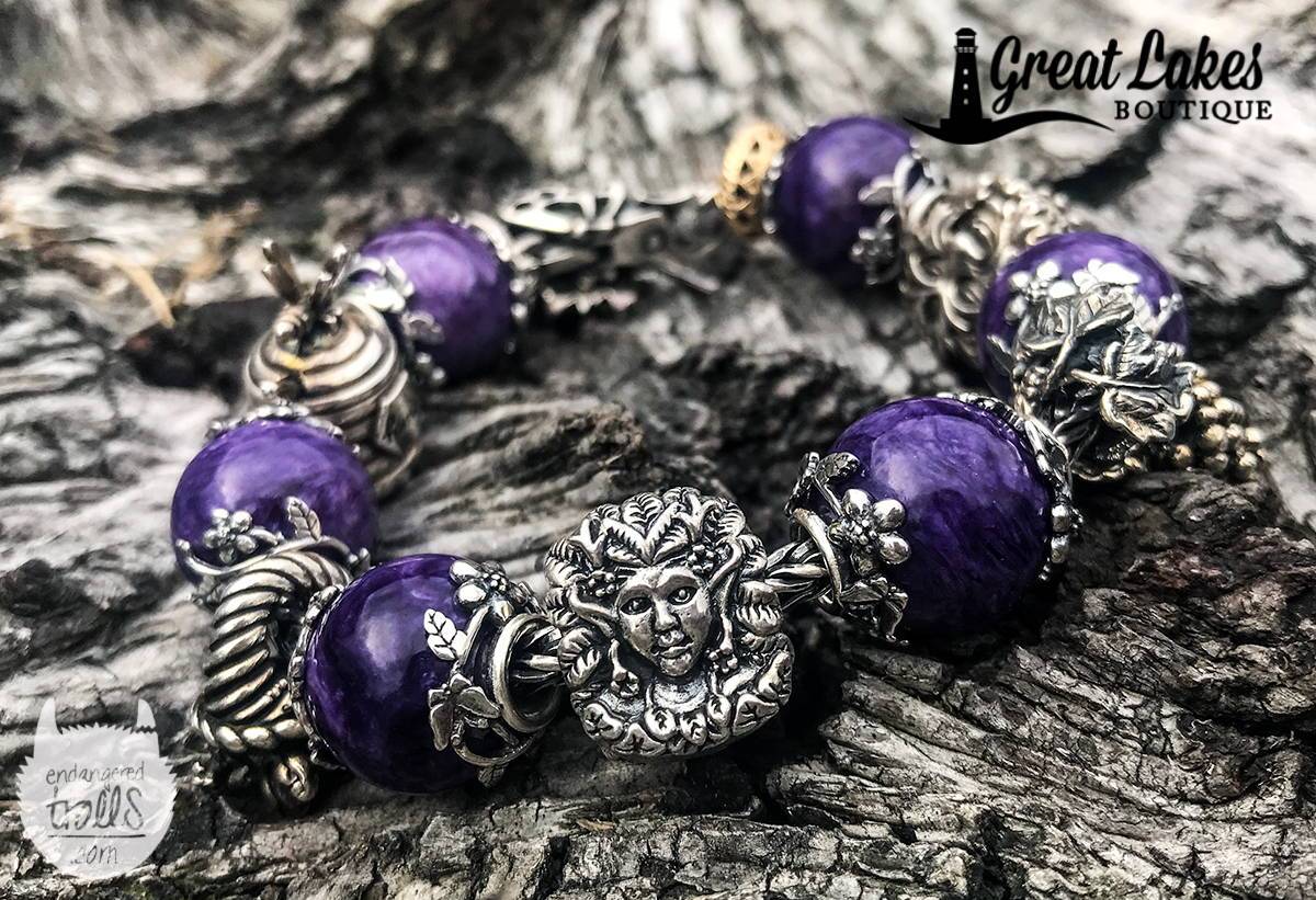 The Palace of Amber Vibrant Violet is one of a series of beautiful focal gemstones with a decorative core. The vibrant violet features a charoite stone, known for it's striking swirling pattern and most commonly purple color.