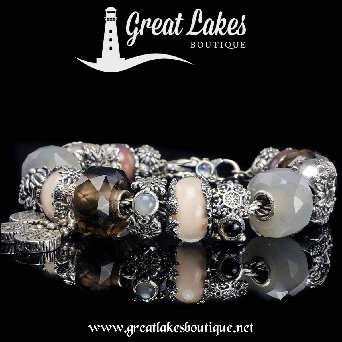 The colors on this bracelet are provided by the new decorative core glass which we just adore. The core is designed to match the Evergreen stopper and it is exclusive. The stones used here are The Palace of Amber smoky quartz and gray moonstones.