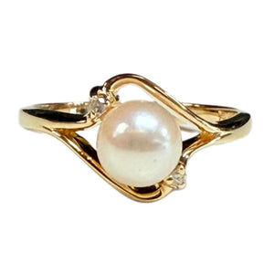 This 10k Gold Pearl & Diamond Ring is such a pretty, feminine and timeless piece. There's something eternally appealing about yellow gold and pearls. This particular ring has two small diamonds added at diagonal points for just an extra sparkle.