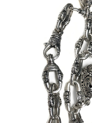 The bracelet features an oval, quite open link style of chain that almost gives the look of a double wrap bracelet. Each link is individually engraved with ornate scrolls and texturing. Five egg shaped charms punctuate the length of the chain. These charms feature citrine, garnet, blue topaz, peridot and amethyst.