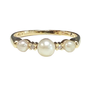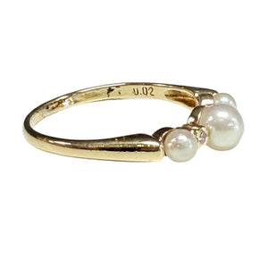 This particular ring is a size 6 1/4 but resizing options are available directly via this page. It measures 1/8 of an inch in width as it sits on the finger. It has a 0.02 carat total diamond weight. The focal pearl is 4 mm while the two accent pearls are 2.75 mm. Finally it weighs 2 grams.