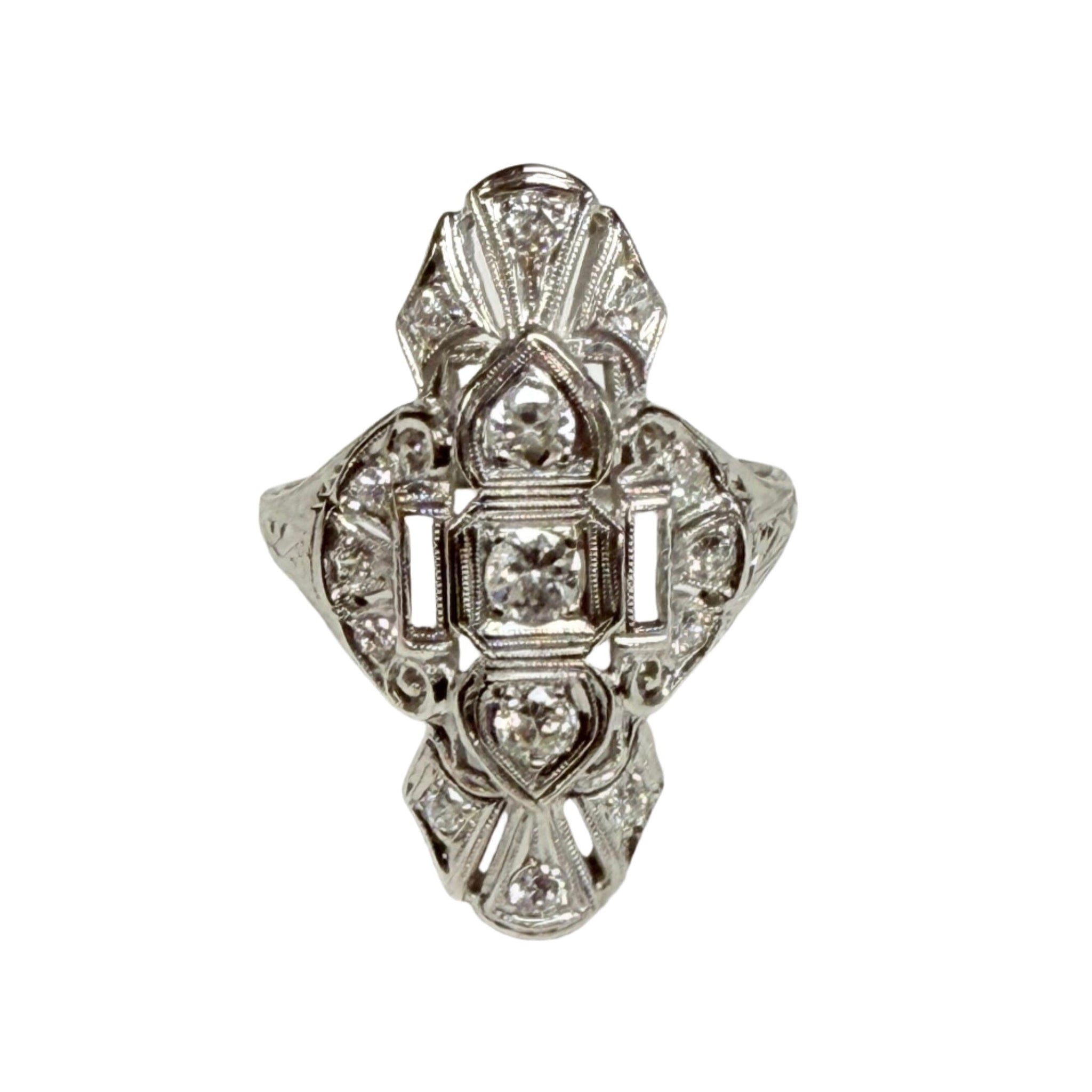 This Platinum & Diamond Art Deco Ring is a quintessential example of art deco jewelry. The vertical design elongates the fingers creating a very elegant, dramatic look.