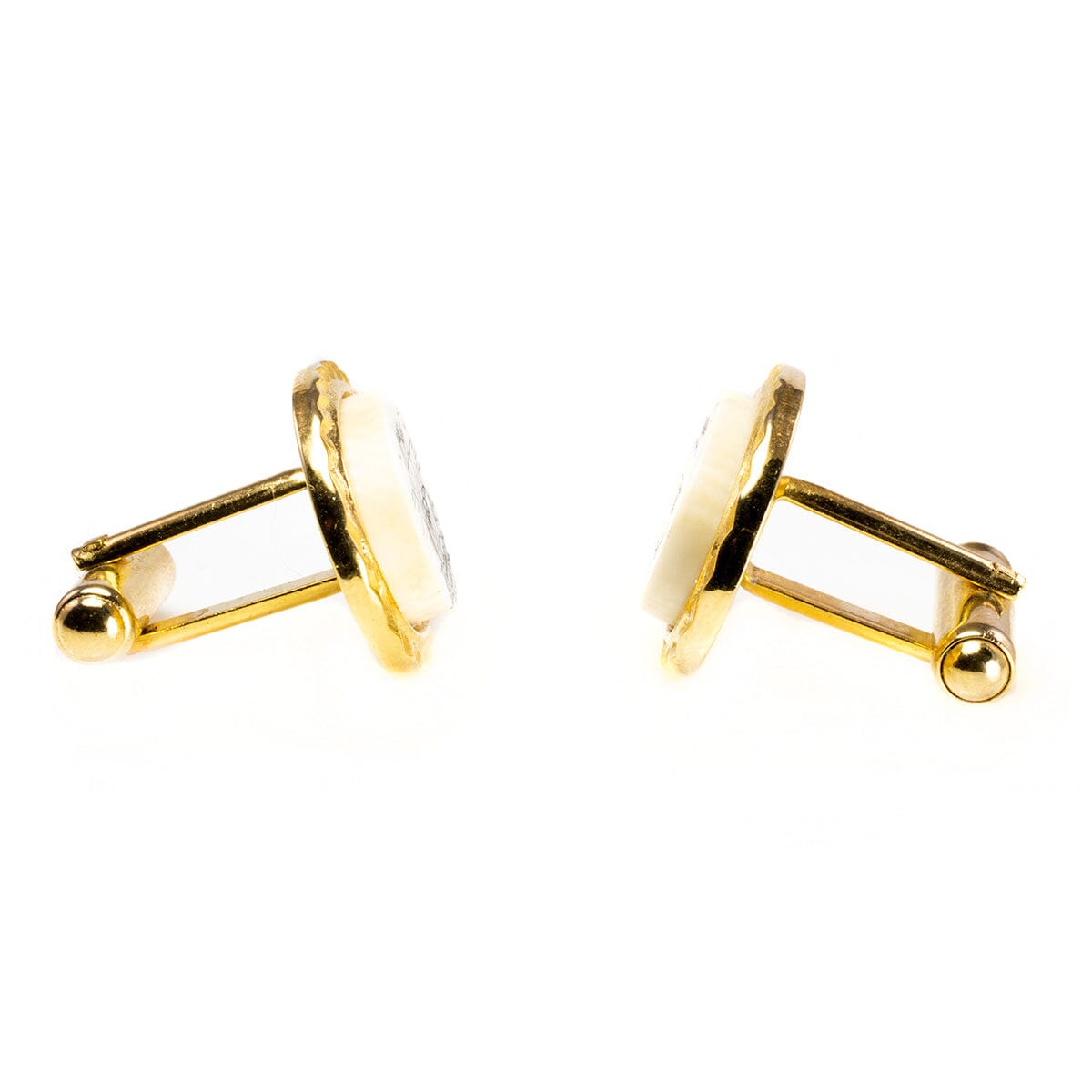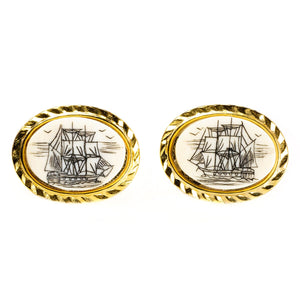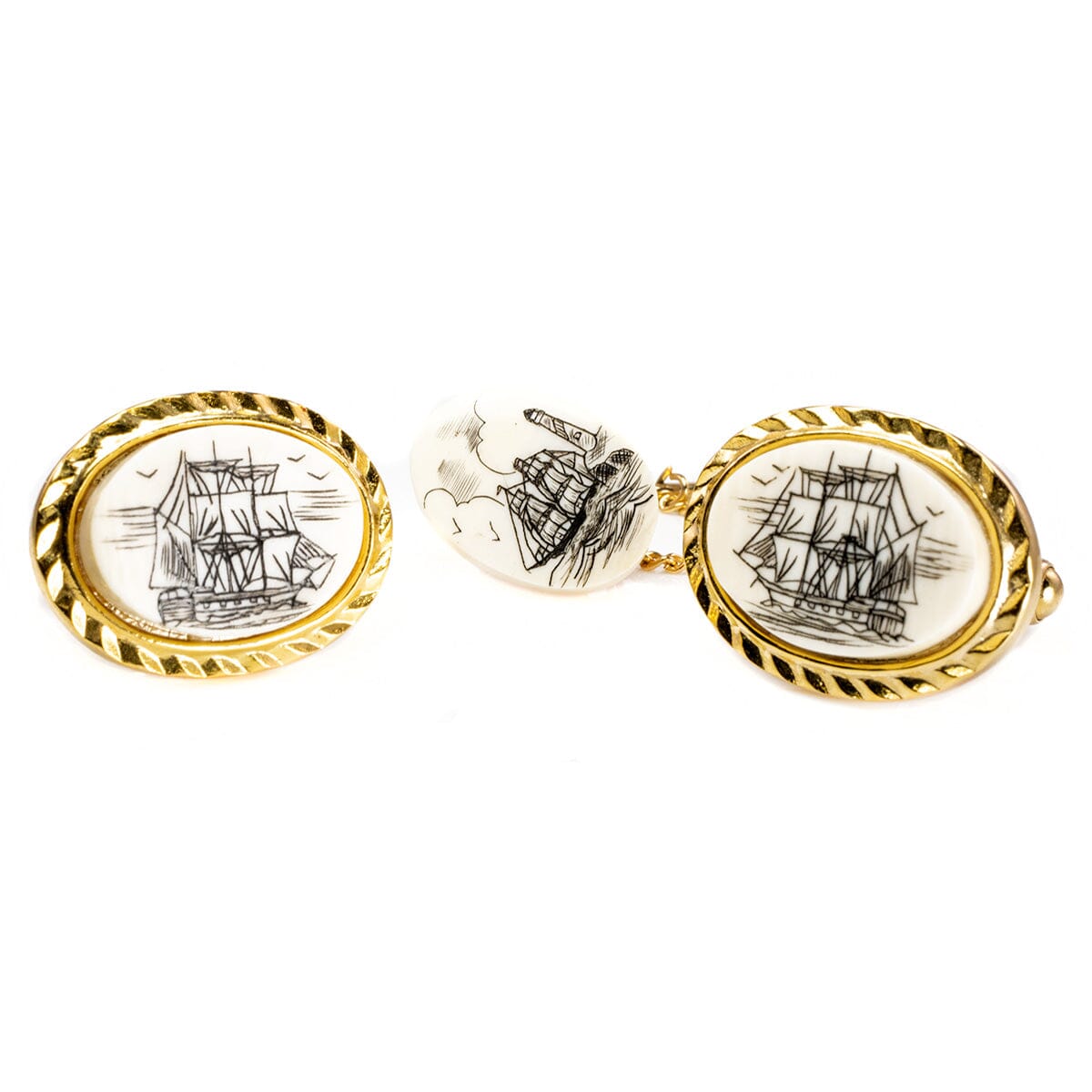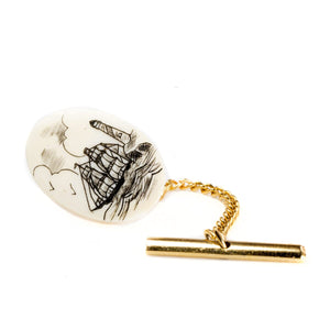 This cufflink and tie pin set features antique scrimshaw pieces that have been carefully preserved and repurposed into wearable works of art. Scrimshaw, a traditional art form practiced by sailors, involves etching intricate designs onto materials. Each cufflink and tie pin boasts a one-of-a-kind scrimshaw drawing, capturing a moment in time and honoring the craftsmanship of the past.