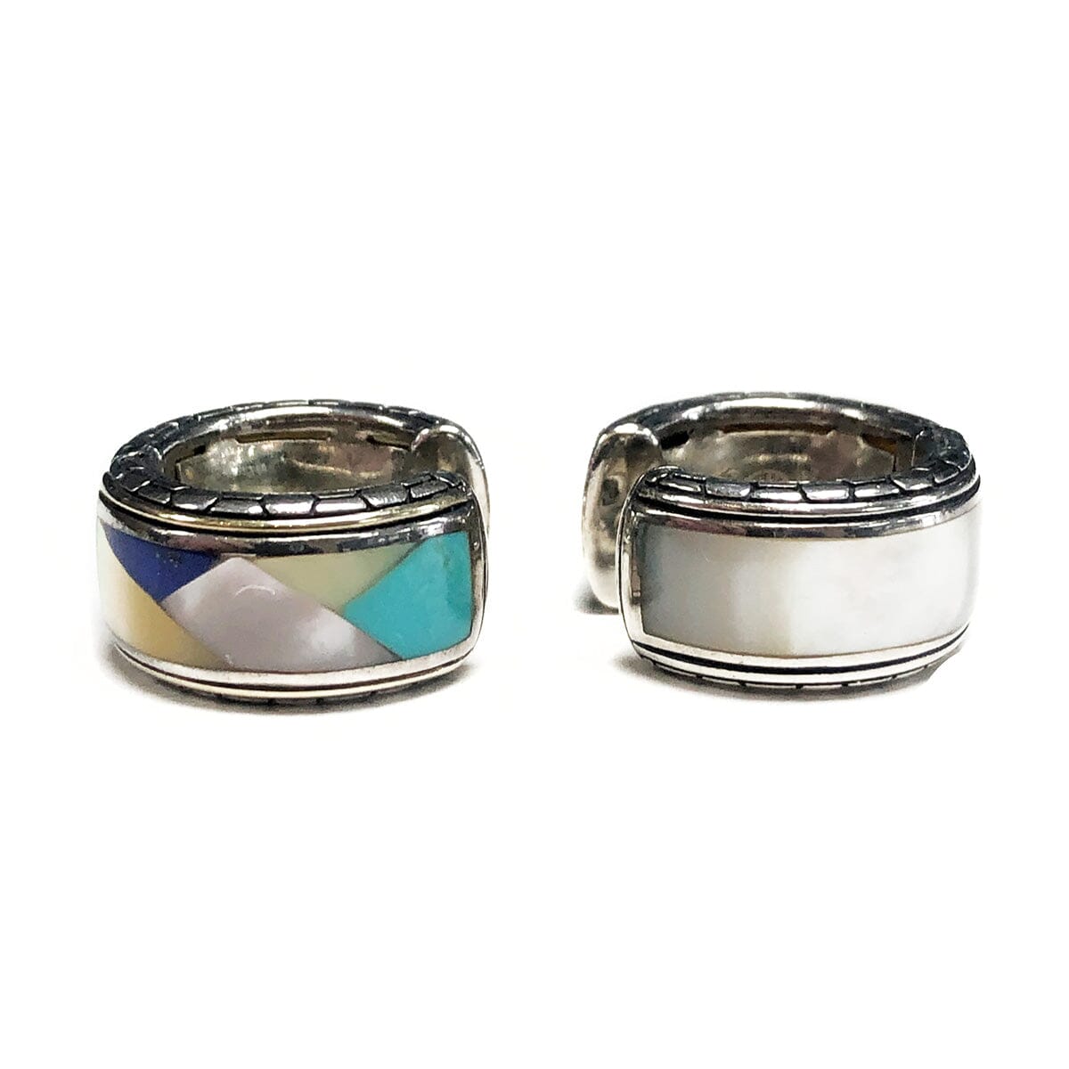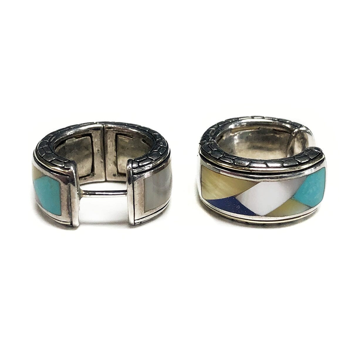 These hoop earrings feature inlaid mother of pearl, turquoise and lapis lazuli, all of which create a feminine, braided pattern across the body.