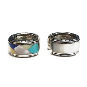 Sterling and 18k Asch Grossbardt Mother of Pearl, Turquoise, Lapis Inlay Hoop Earrings are meticulously executed. Asch Grossbardt are famed for their geometric styles and inlaid work which is evident in this piece.
