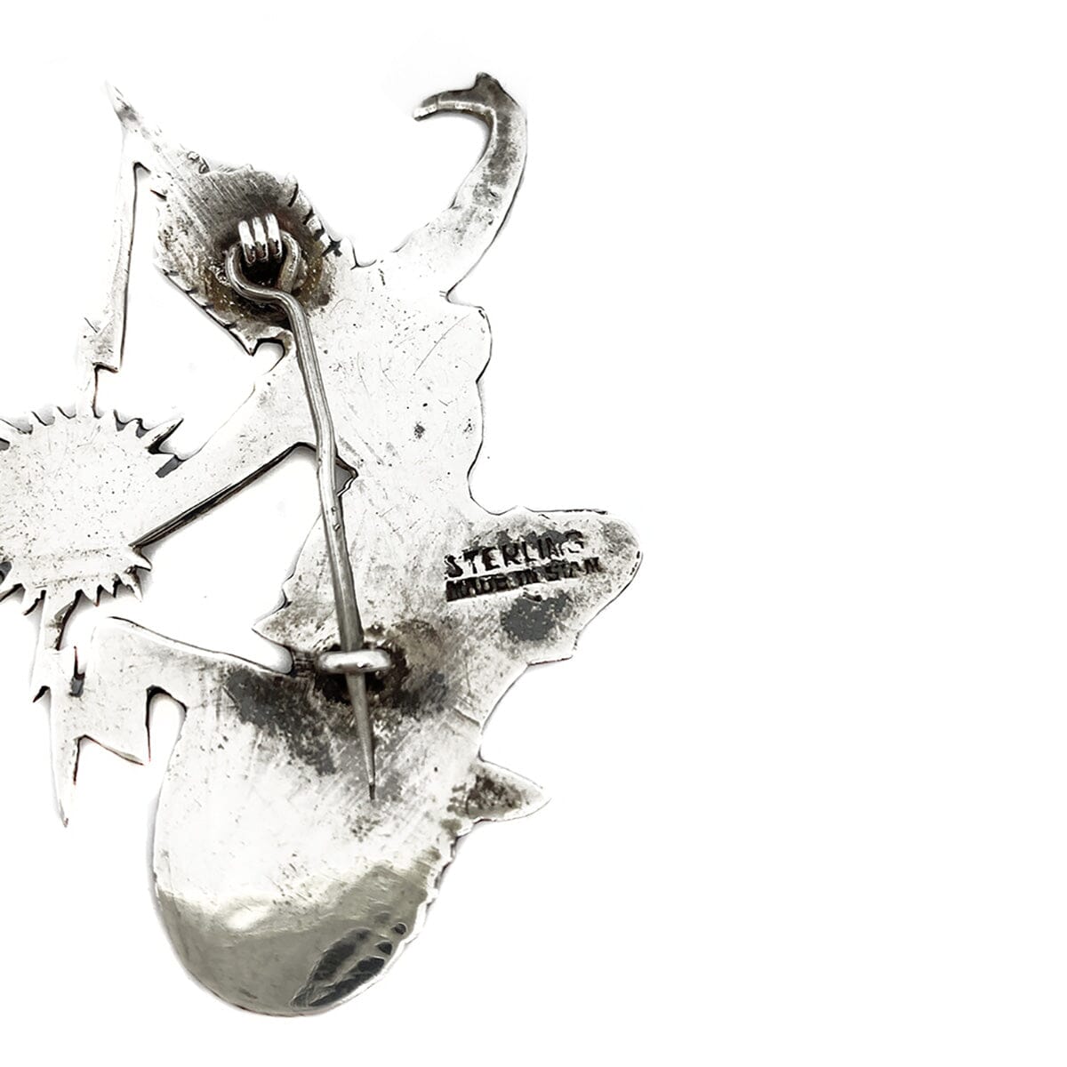 As is characteristic for these pieces, the body of the pin is created from black enamel, with accents highlighted with sterling silver.