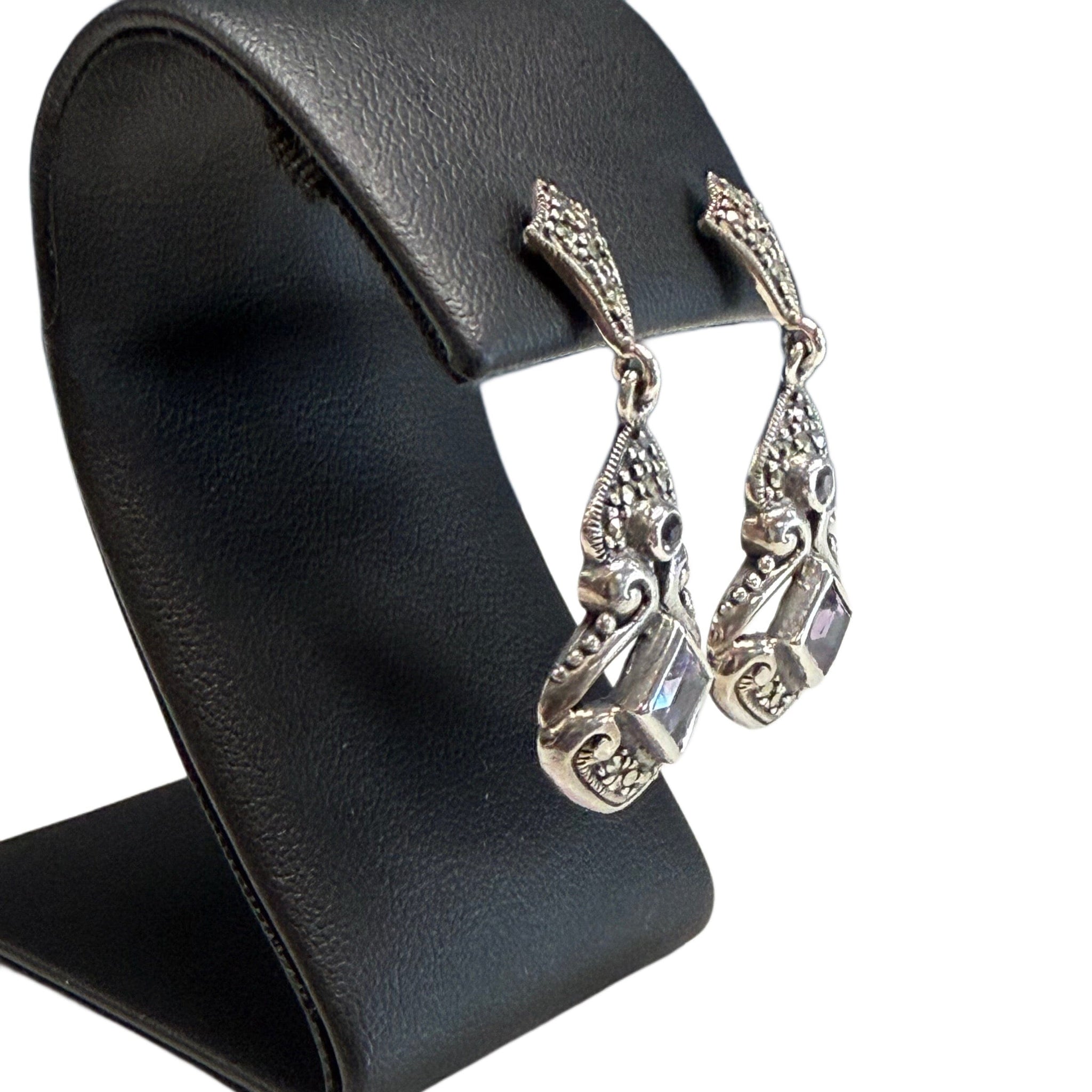These Silver Amethyst & Marcasite Earrings are a beautiful, ornate pair of earrings with a gothic quality to them. The scrolling silverwork is accented with small marcasite gemstones and four amethysts, creating a lovely color combination.