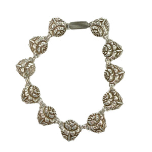 This Silver Rose Bracelet is an unusual and striking piece with a strong vintage vibe. It comprises individual silver links, all crafted to look like roses. It has a certain whimsical feel to it.