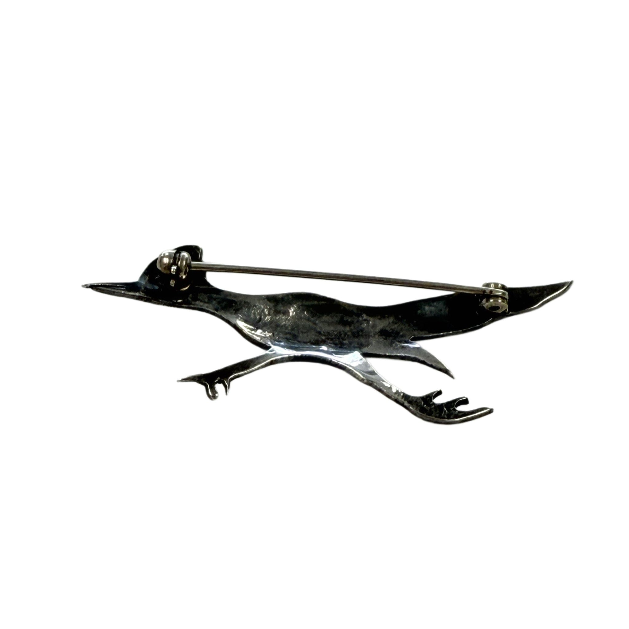 This Silver & Turquoise Roadrunner Pin is an usual piece and well detailed. It depicts a roadrunner in full stride and features a small turquoise stone for the eye.