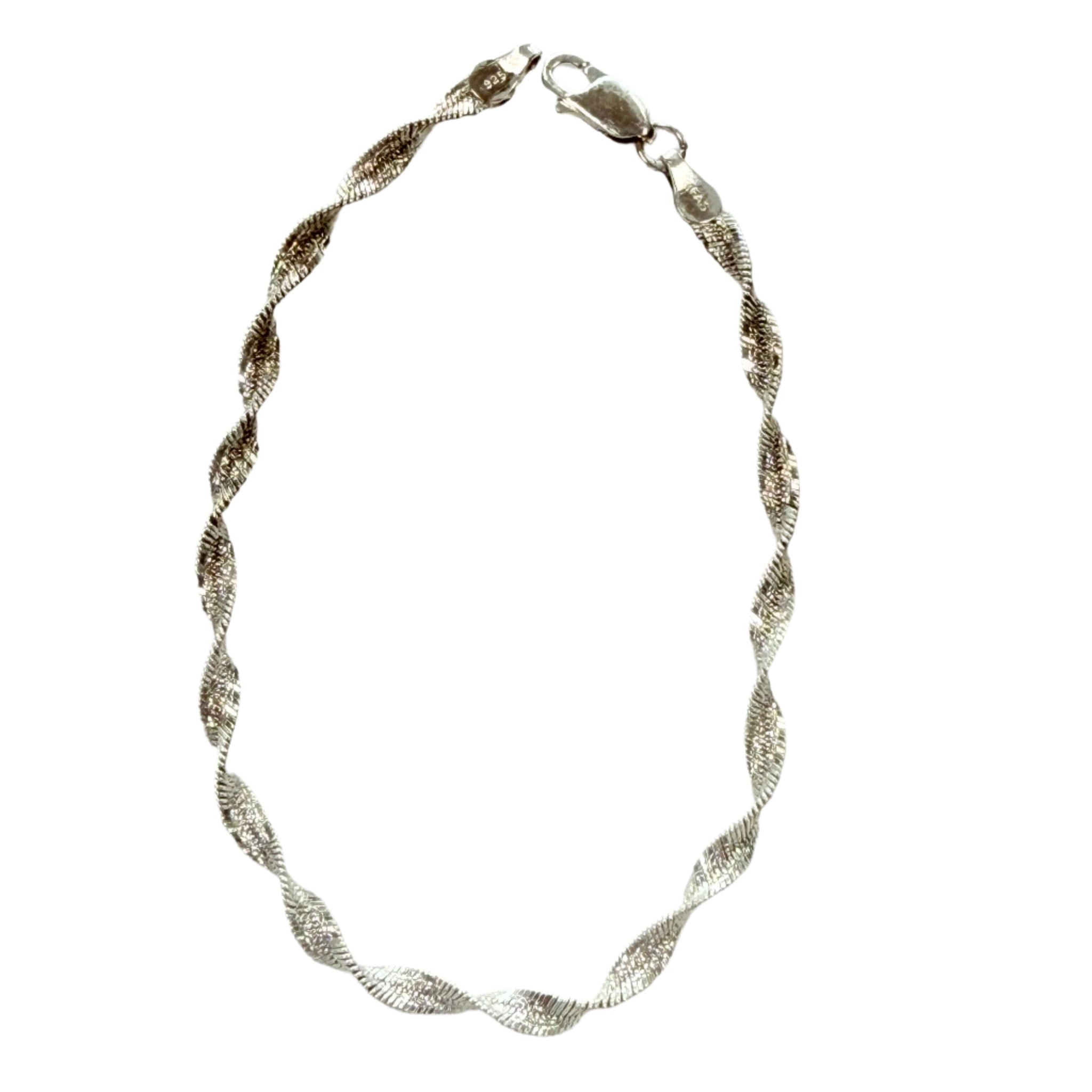 This Twisted Silver Bracelet is a pretty, feminine piece. The twisted design makes this a very fluid looking chain, constantly catching the light with its various angles.