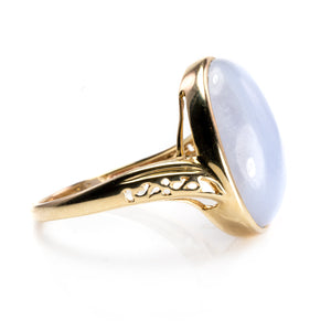 This 10 k Yellow Gold Blue Agate Ring features a focal cabochon stone set in a gold band. The stone itself is a blue lace agate. These stones have a soft blue shade but are characterized by almost ice like international striations.