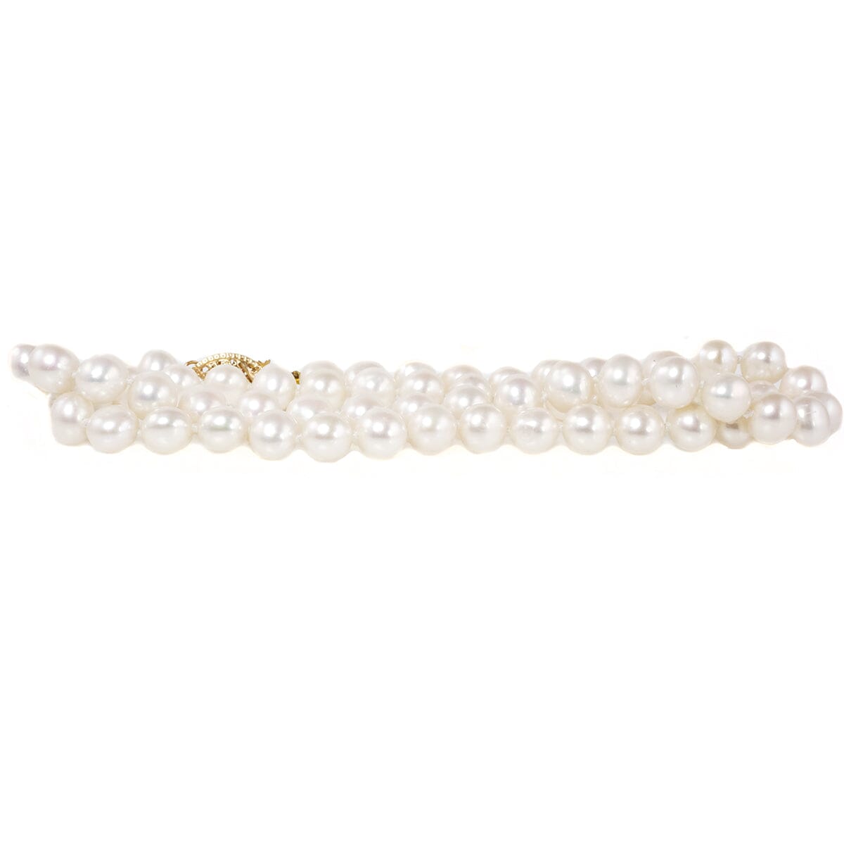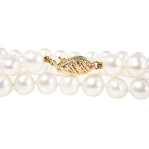 This necklace features white freshwater pearls in a single strand with an ornate 14 k yellow gold clasp. The combination of yellow gold and pearls is just exquisite. There's a nice contrast between the sheen of the pearls and the warm finish of the gold.