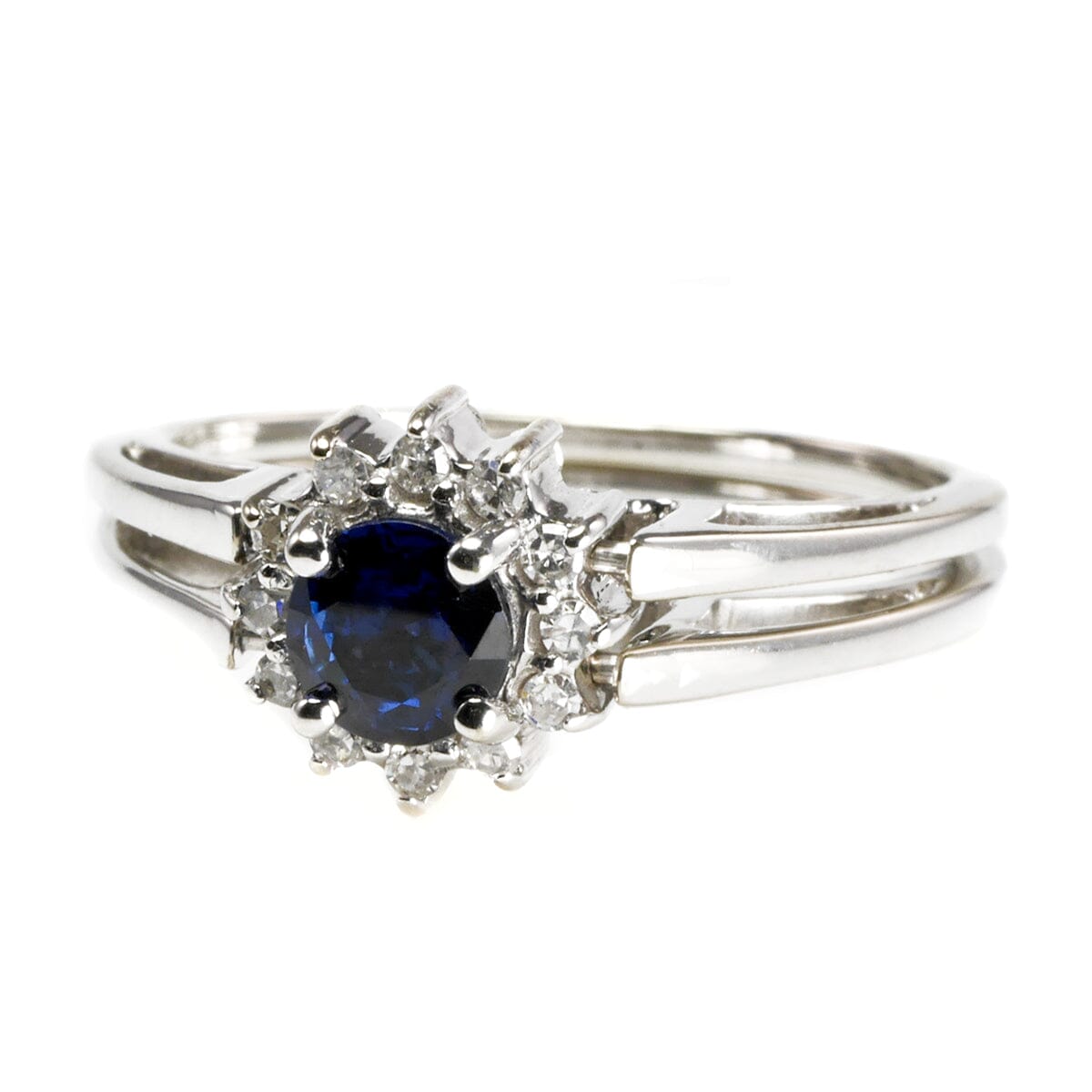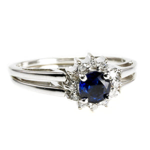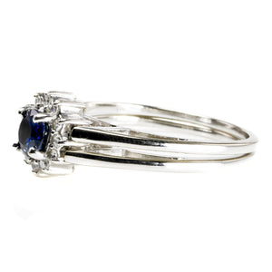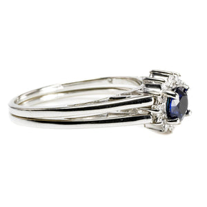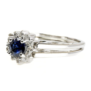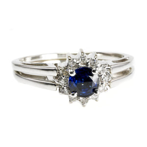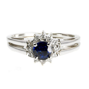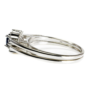 This 14 k White Gold Diamond & Sapphire Ring boasts a classic, timeless and elegant design. This ring features the much loved combination of deep blue sapphire, dazzling diamonds and white gold. This is an enduring combination of colors. The ring is ideal for everyday wear.