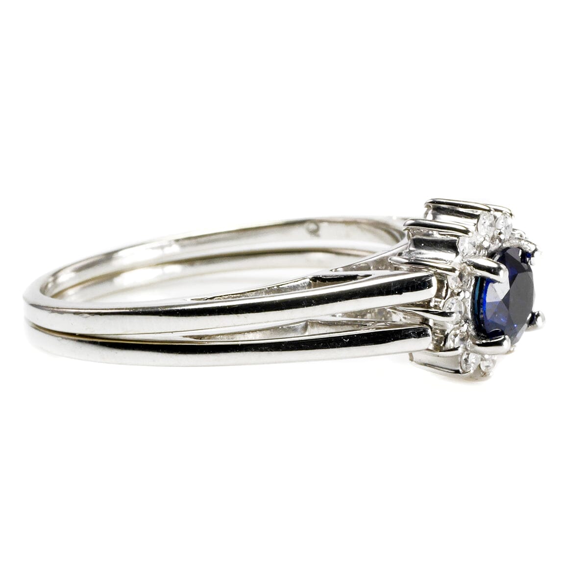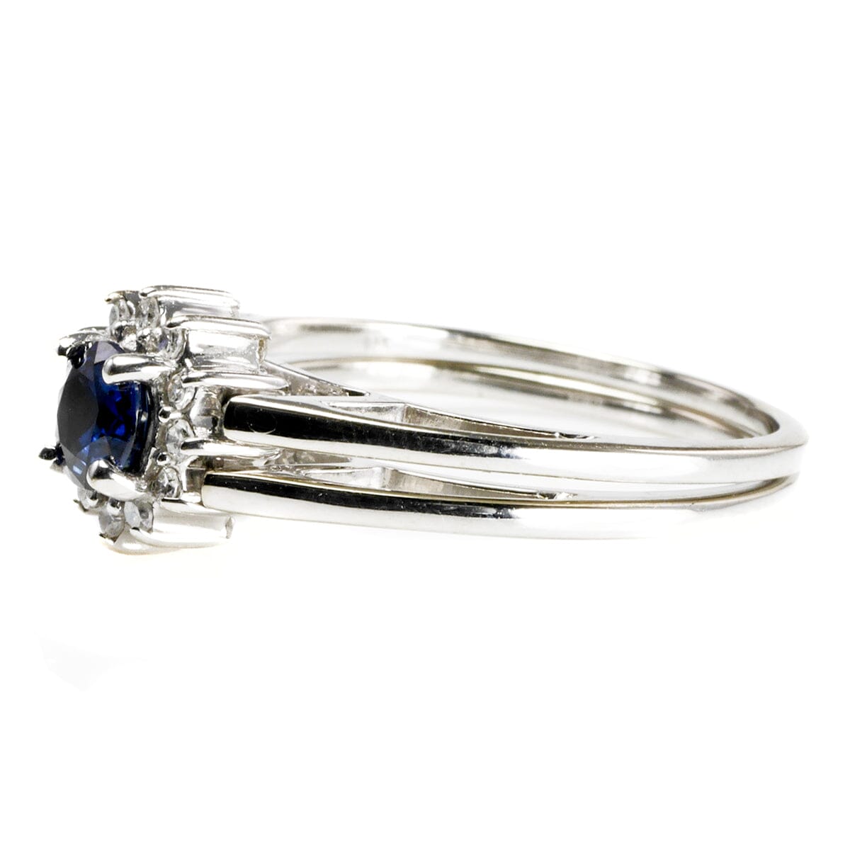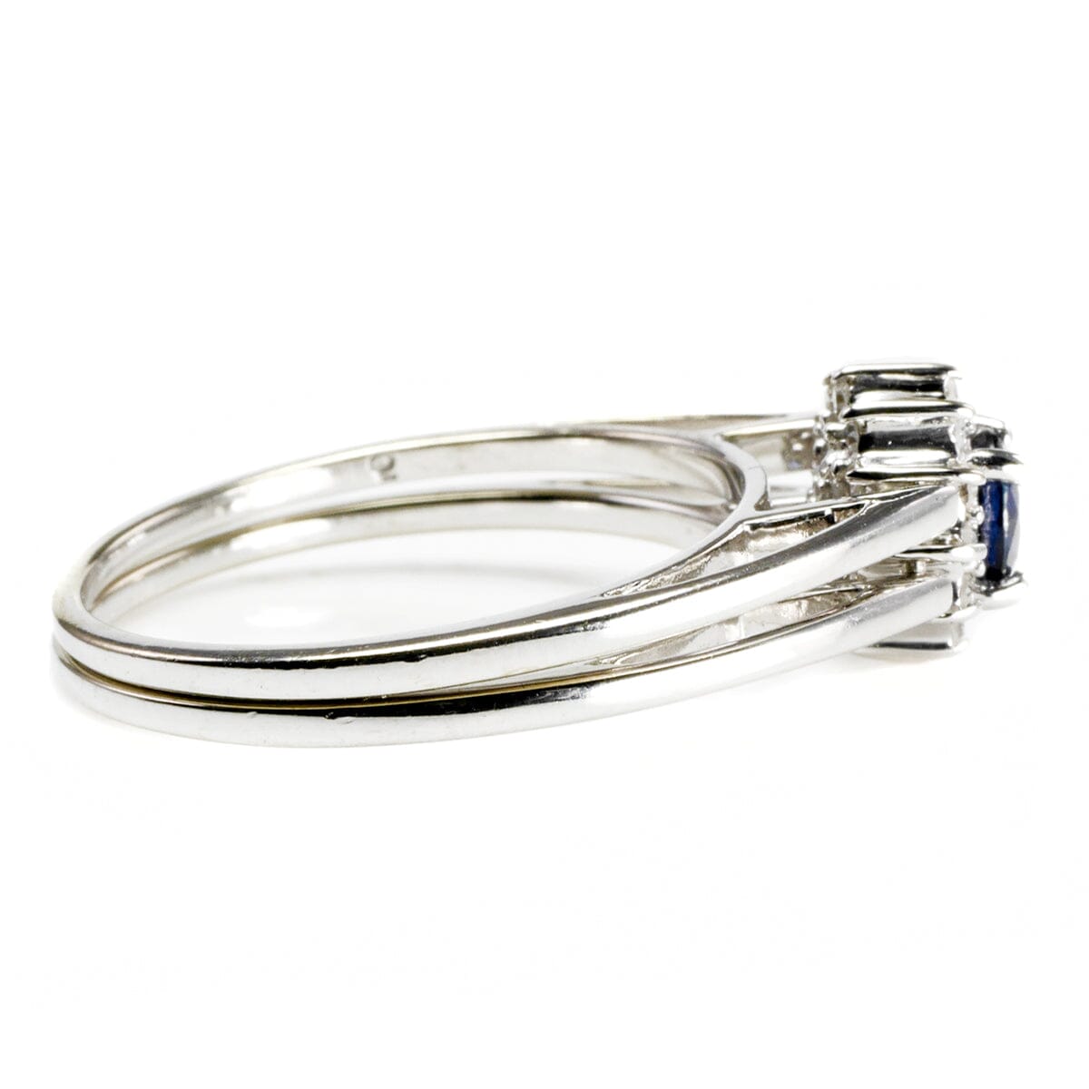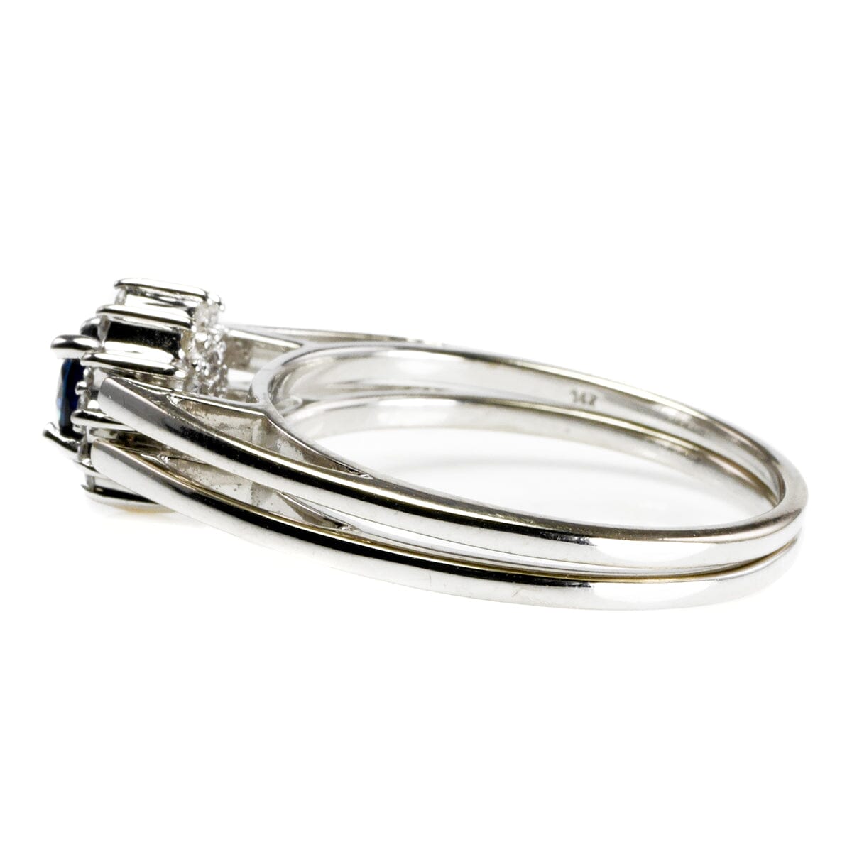 This ring is a size 7. It measures 8 mm in height as it sits on the finger. The very back of the band measures 2 mm in width. The focal sapphire measures 4 mm by 4 mm and the ring weighs 3.5 grams.