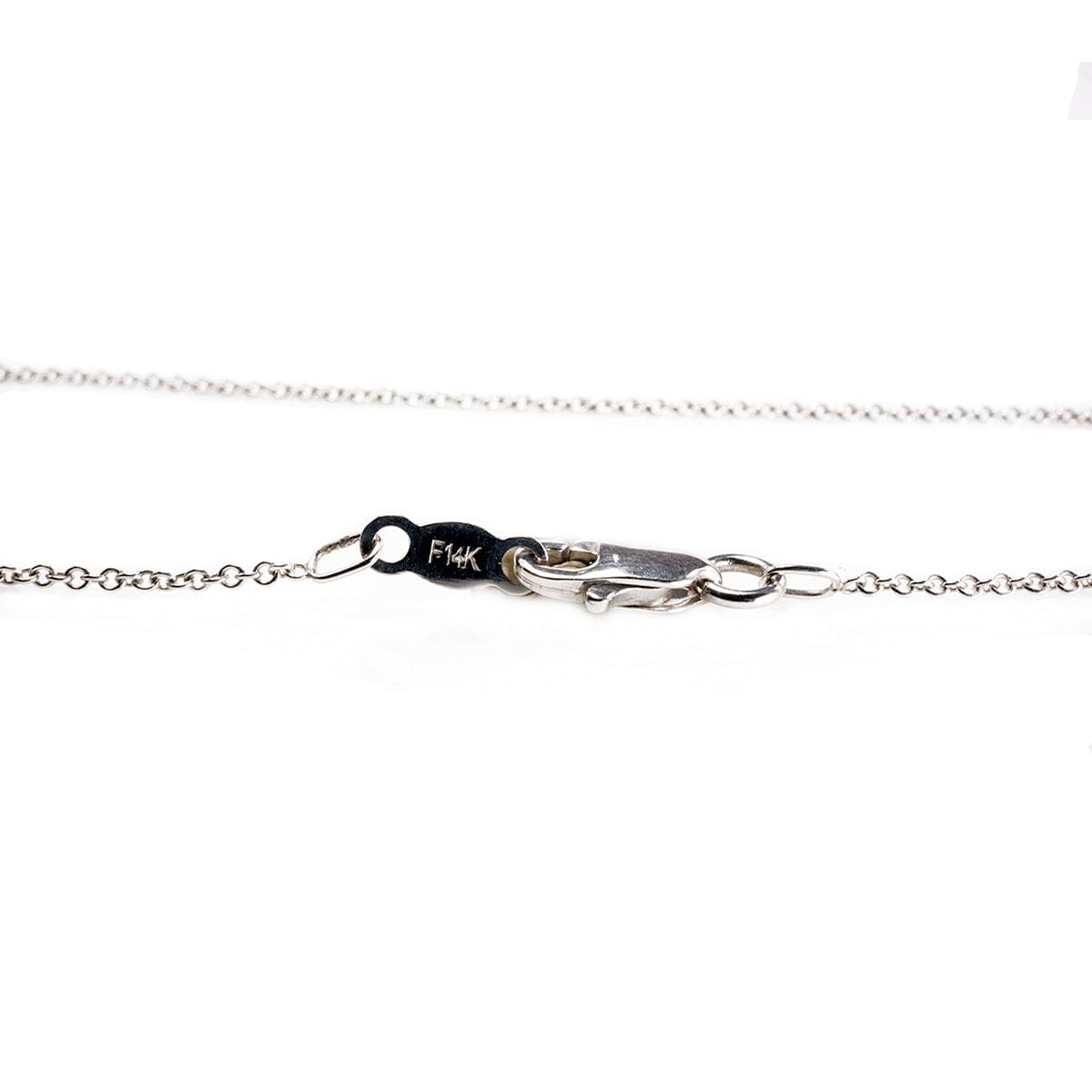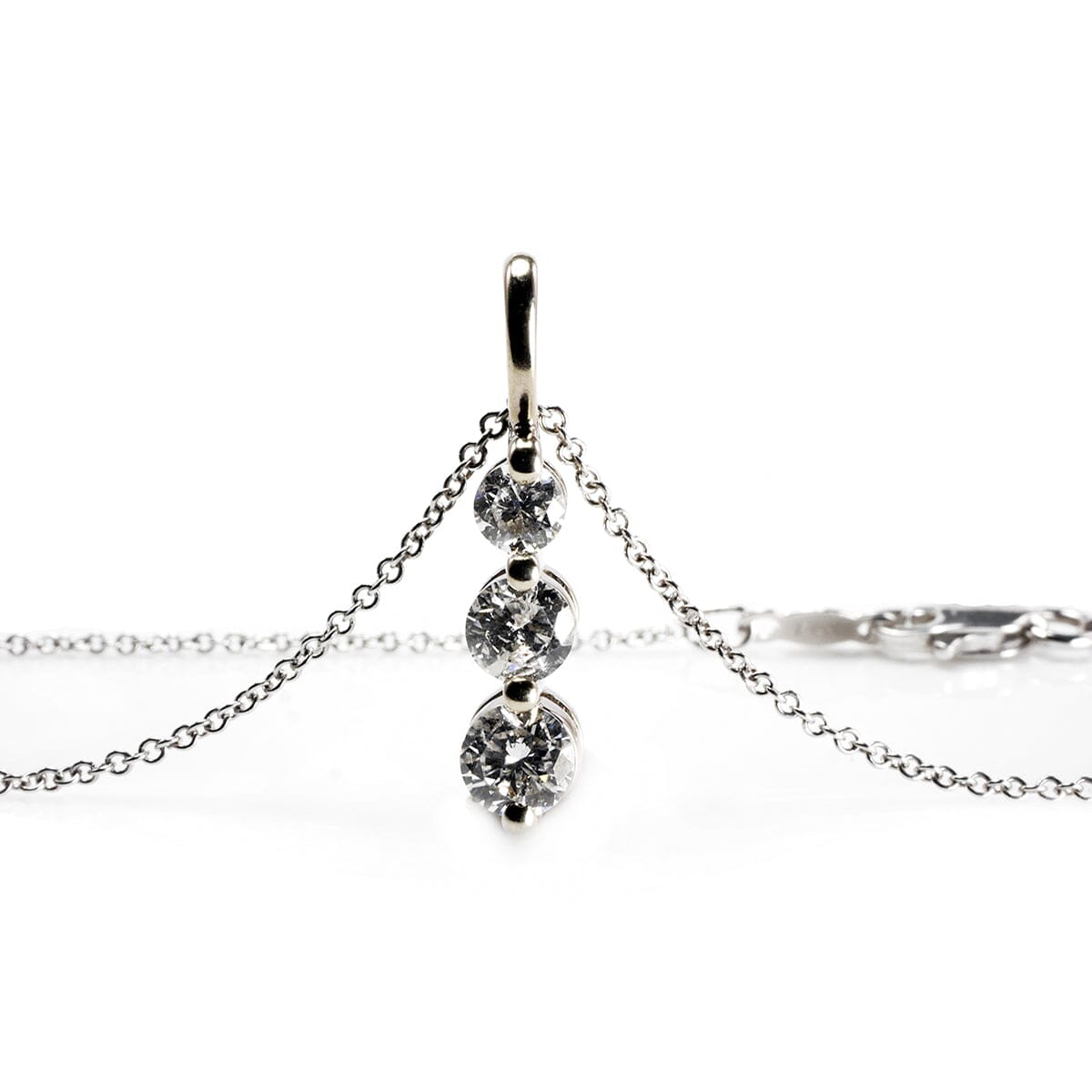 This 14 k White Gold Journey Pendant is a ready to wear piece, including both the pendant and the necklace. Journey pendants are designed to represent our closest relationship. The smallest diamond at the top represents our past. The center diamond represents the present and the bottom represents our future. They increase in size to represent how love grows over time. This is a beautiful, contemporary necklace that will suit all occasions and can be dressed up or down.