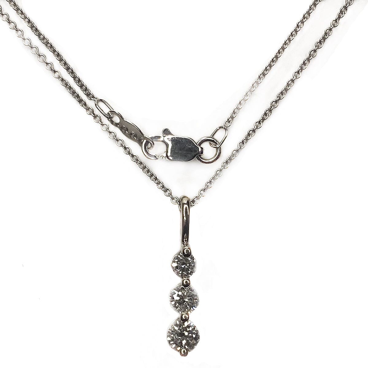 The pendant measures 3/4 of an inch or 21 mm in length. The three diamonds combined measure 0.6 inches or 15 mm in length. The necklace is an 18 inch white gold chain and the total carat weight of the three stones is 3/4 of a carat.