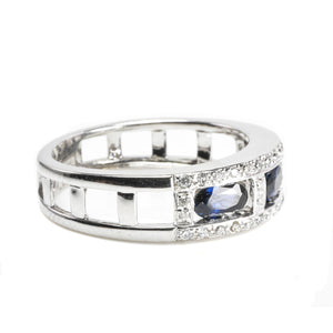 This 14 k White Gold Sapphire and Diamond Ring feels chic, understated and ideal for bringing everyday sparkle to your jewelry, particularly if you still yearn for the inky colors of sapphire. Though the band is diamond accented, it's styling is still minimalistic, with no ornate swirls nor details.