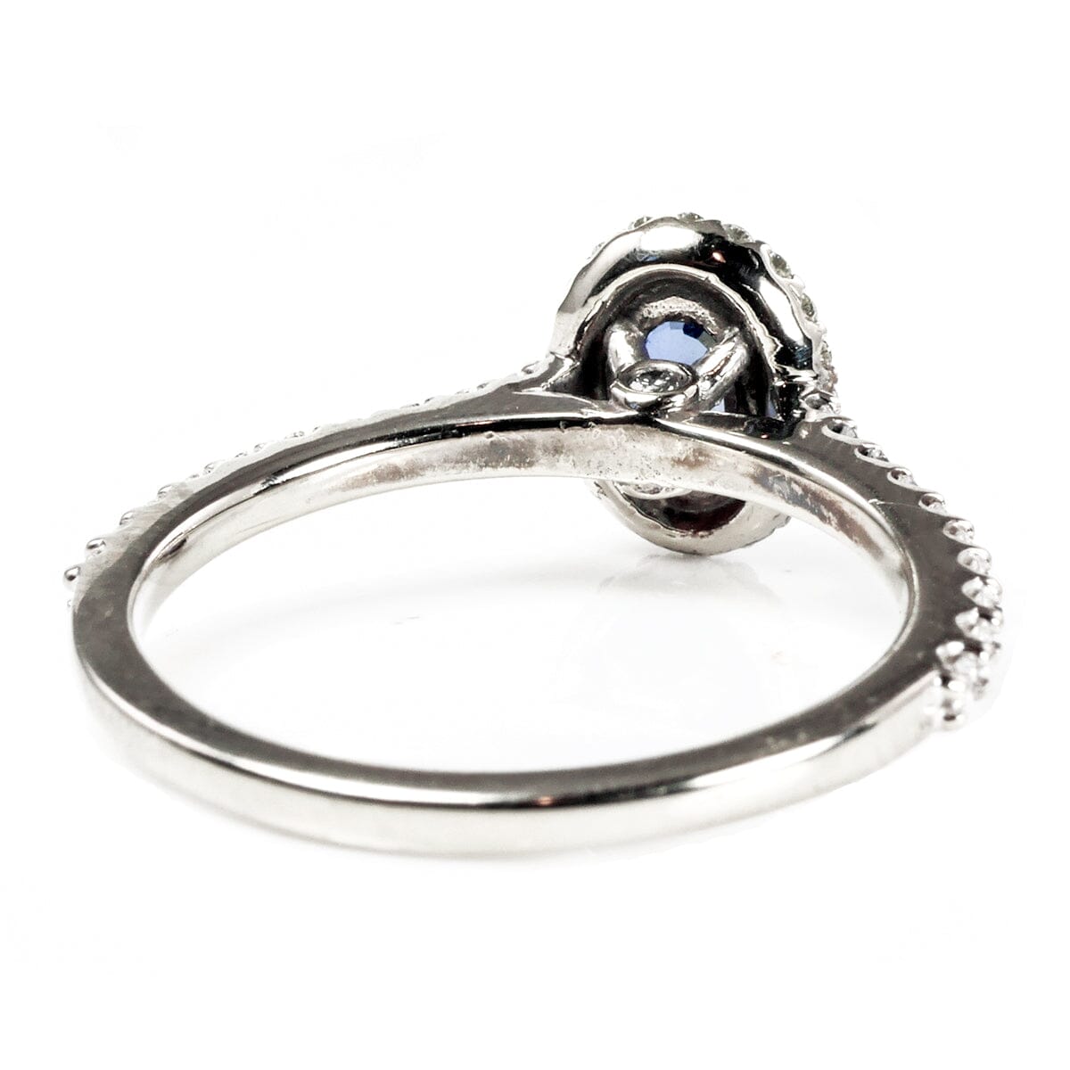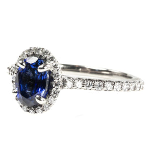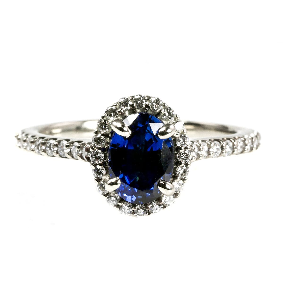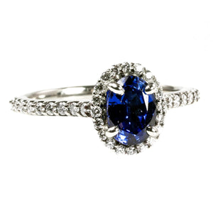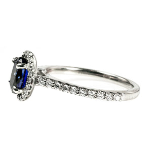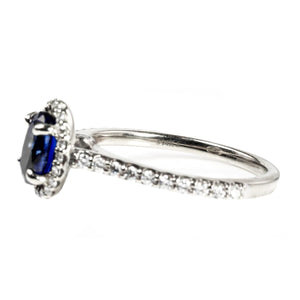 It features a focal sapphire measuring 7 mm in height by 5 mm in width. This stone is then framed with a diamond halo setting, delivering a spectacular sparkle. The diamond accents continue half way down the finger on either side.