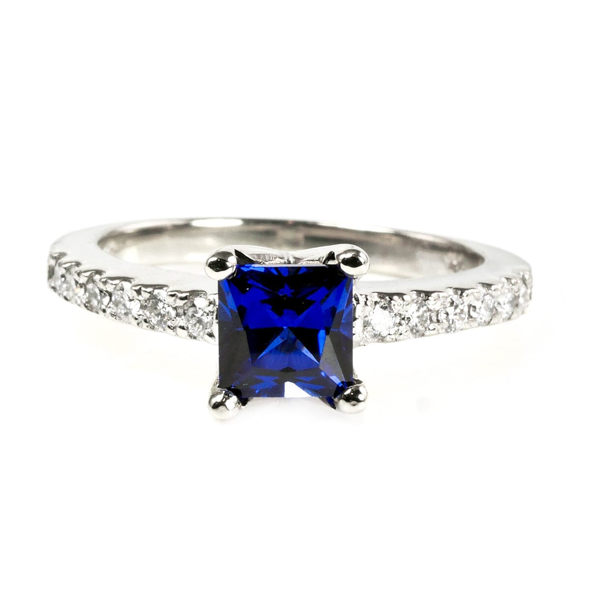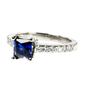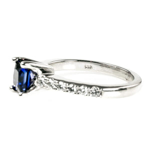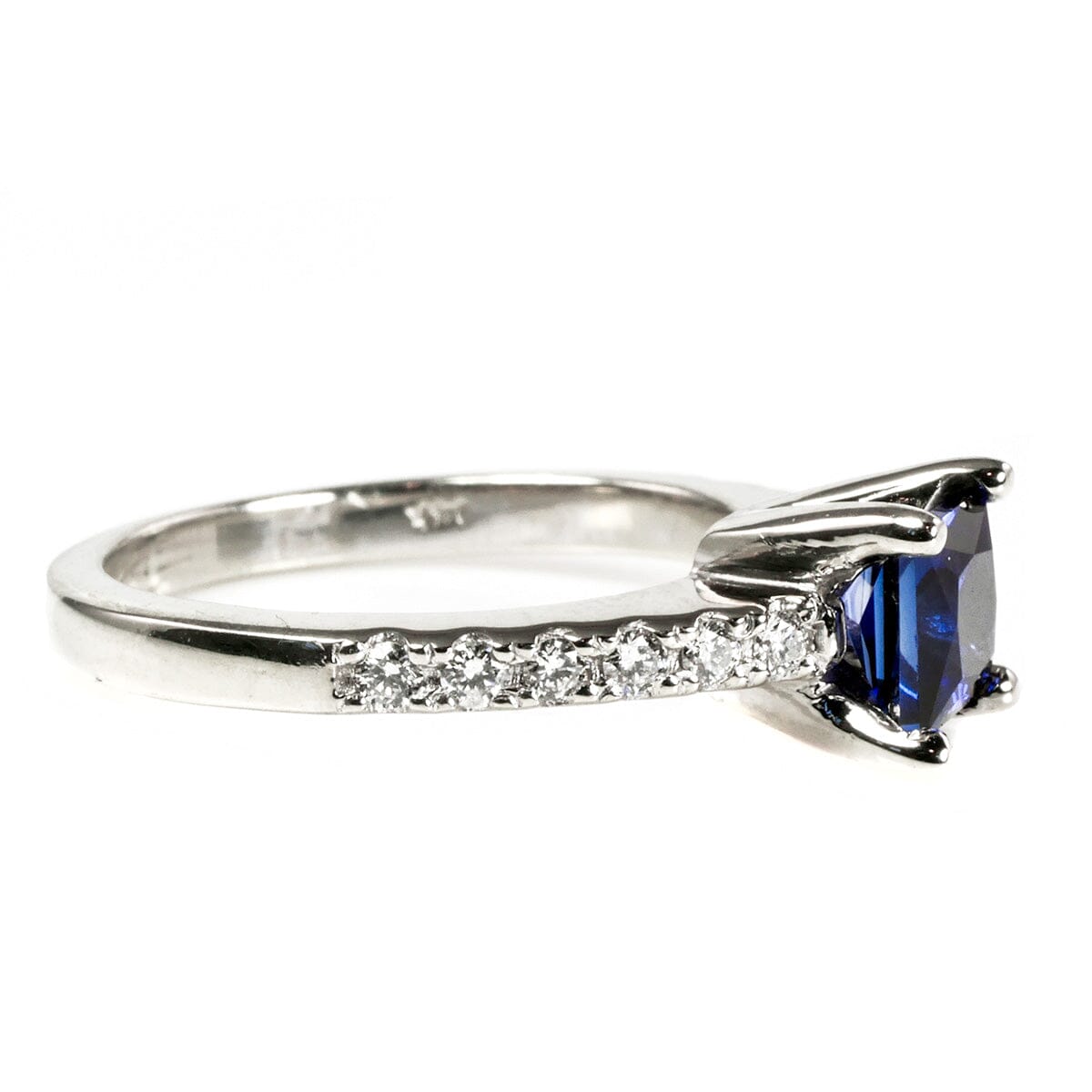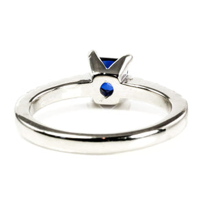 The central sapphire is 0.65 carat or 5 mm by 5 mm, making it a really nice size. It's neither overpowering, nor too small to be recognized. Equally it's a truly lovely deep sea shade. At the same time you don't sacrifice the incredible sparkle that comes from diamonds as the stones extend half way around the finger on either side.