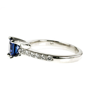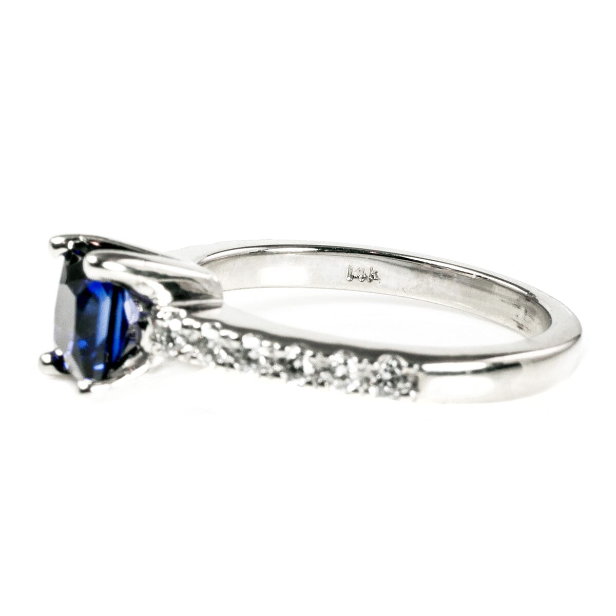 This 14 k White Gold Sapphire & Diamond Ring is a classical & timeless design. That said it also taps into the recent trend for white gold & sapphire rings, as popularized by a number of celebrities in addition to British royalty.