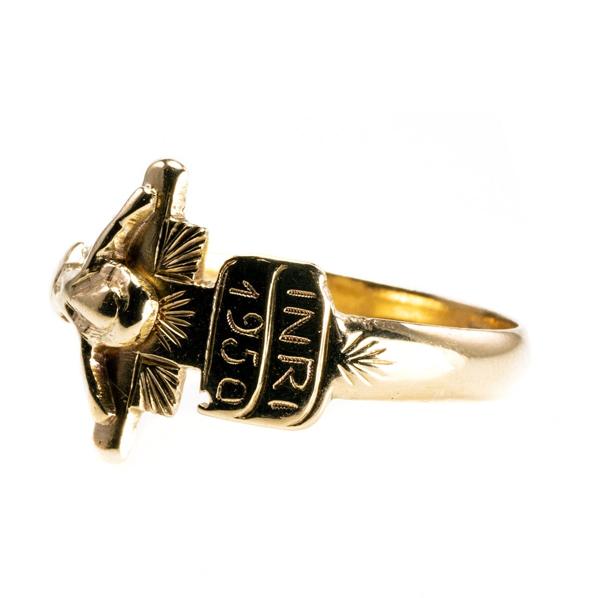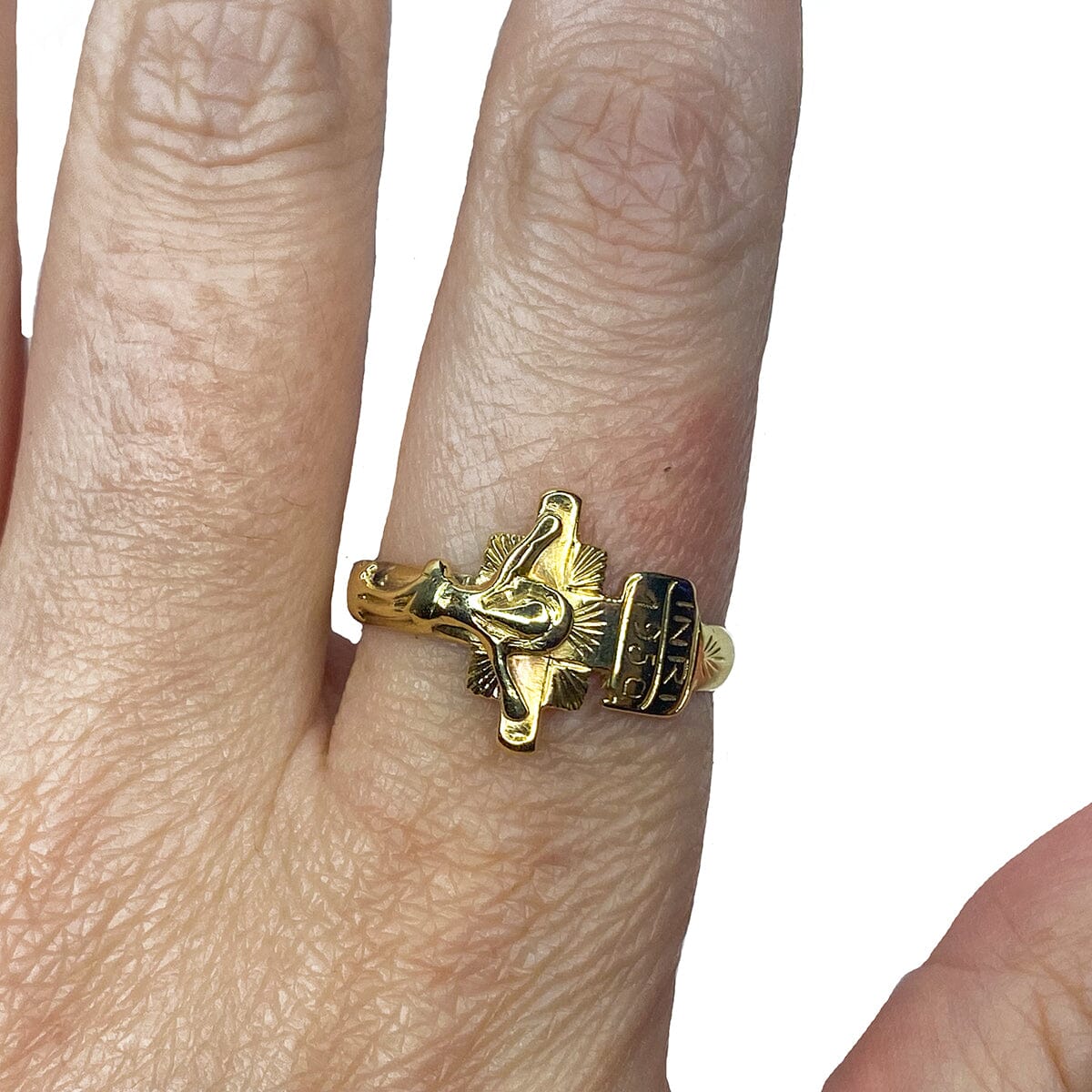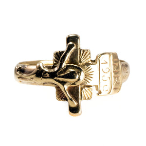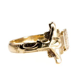 This is a classic 14k Yellow Gold Crucifix Ring, ideal for everyday wear. Above the crucifix is the engraving INRI (Iēsus Nazarēnus, Rēx Iūdaeōrum,) or "Jesus the Nazarene, King of the Jews" (John 19:19.) Below that the year 1950 is engraved too.