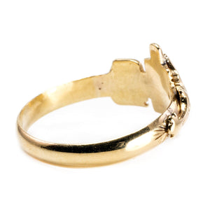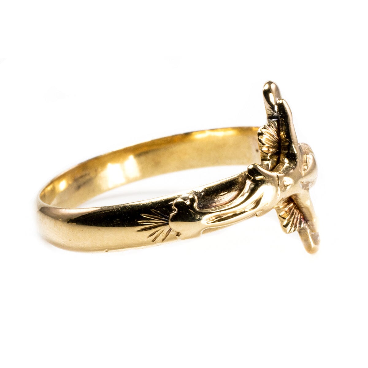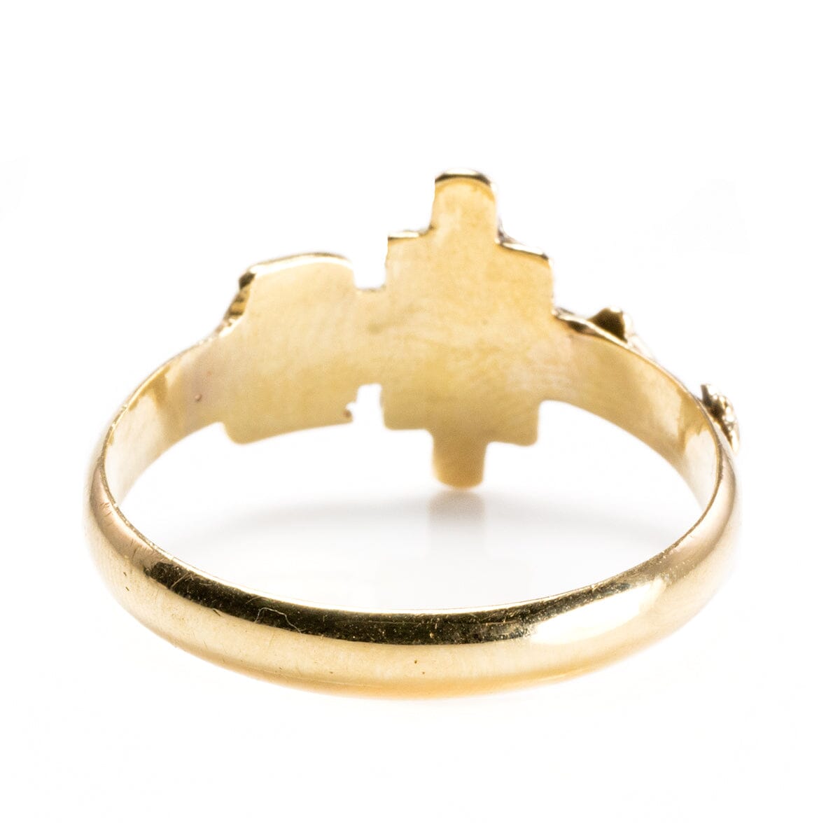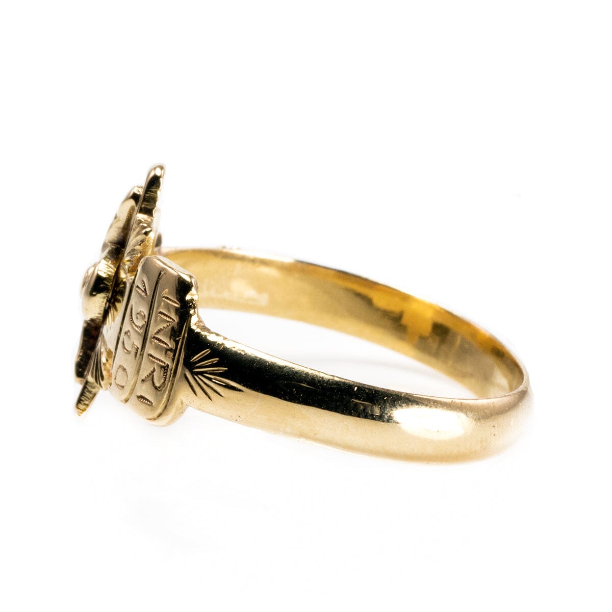 This is a classic 14k Yellow Gold Crucifix Ring, ideal for everyday wear. Above the crucifix is the engraving INRI (Iēsus Nazarēnus, Rēx Iūdaeōrum,) or "Jesus the Nazarene, King of the Jews" (John 19:19.) Below that the year 1950 is engraved too.