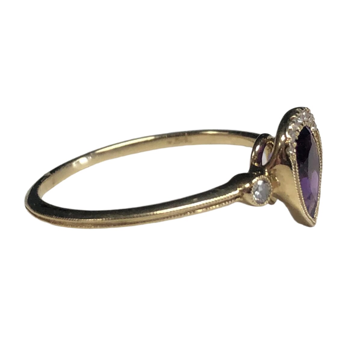 This ring is currently a size 7 but resize options are available directly via this page. The amethyst is approximately 3/4 of a carat. The ring boasts a further approximately 0.08 carat total diamond weight. The ring measures 3/8 of an inch in height as it sits on the finger. Finally it weighs 1.6 grams