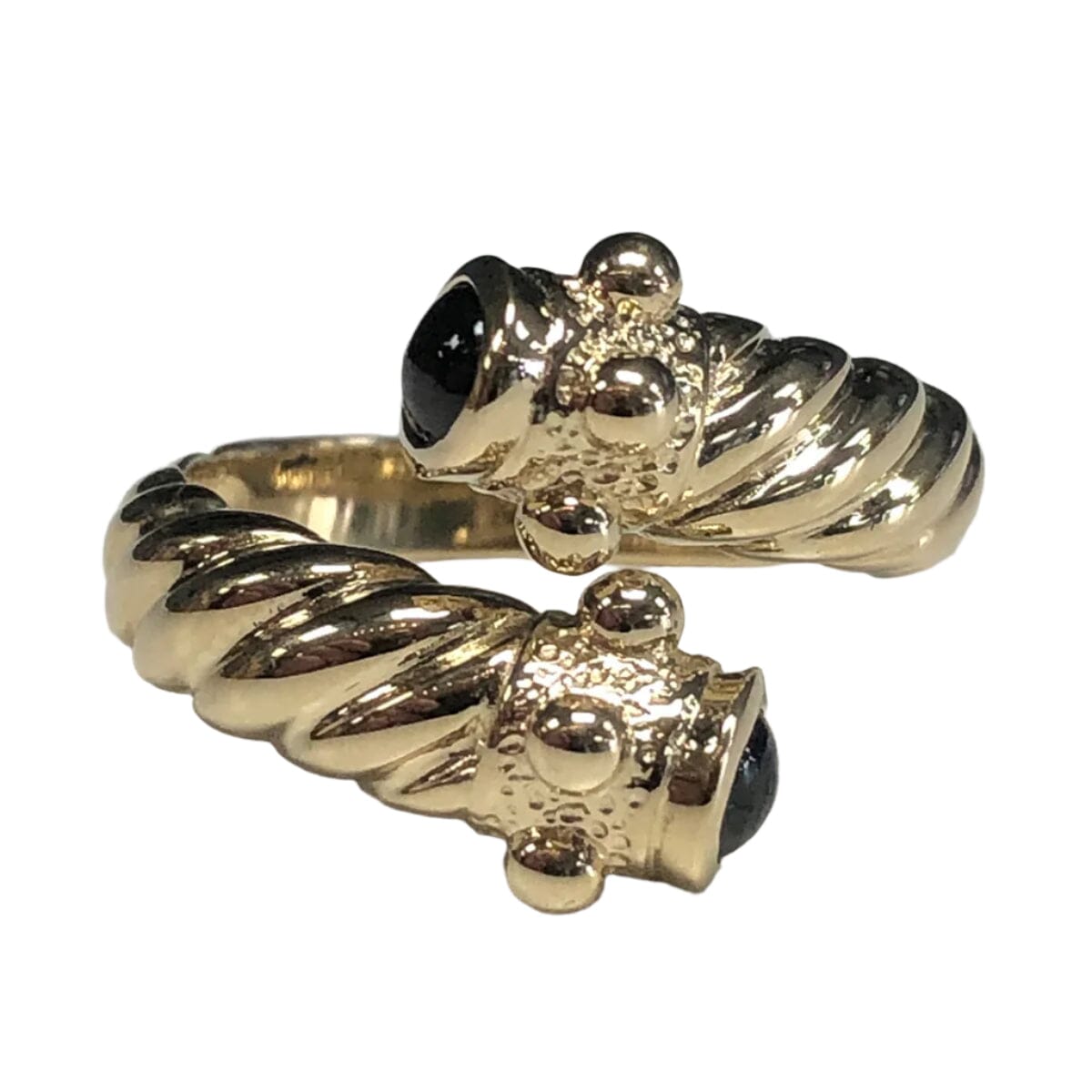 This 14k Gold & Black Onyx Ring is a striking and unusual piece. The body of the ring is a twisted, yellow gold band in a wrap around style. Subtle black onyx gemstones add elegance and class to the ring and results in a timeless combination.