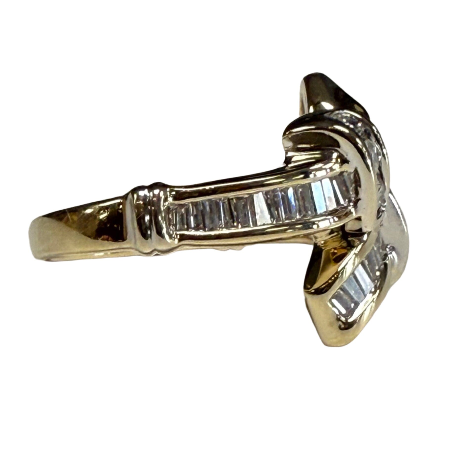 This Gold & Diamond Ring is such an unusual and rather dramatic piece. Accented with both small round diamonds and baguettes, the design of the ring is a little reminiscent of buckles.
