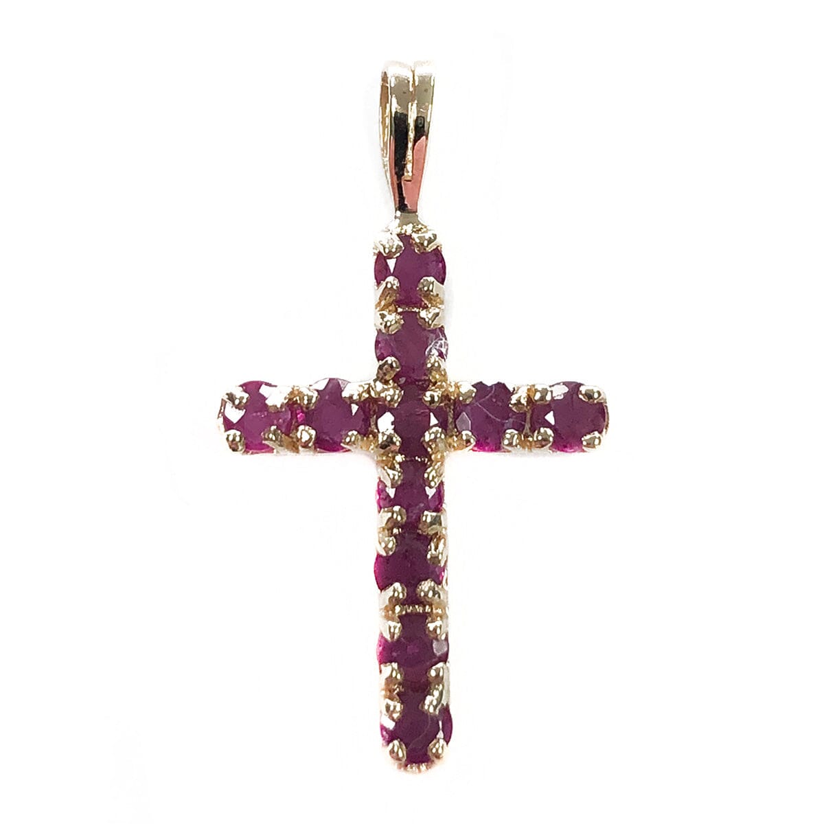 This 14k Gold & Ruby Cross Pendant features beautiful, cerise gemstones in a simple yellow gold setting. The end result is an ornate cross, ideal for everyday wear and that symbolizes the importance of the wearer's faith perfectly.