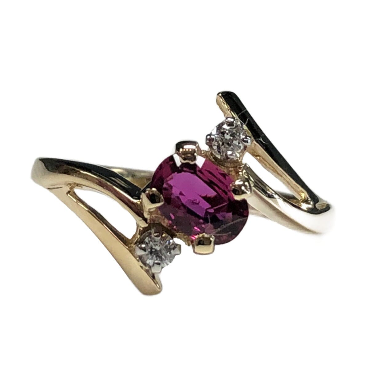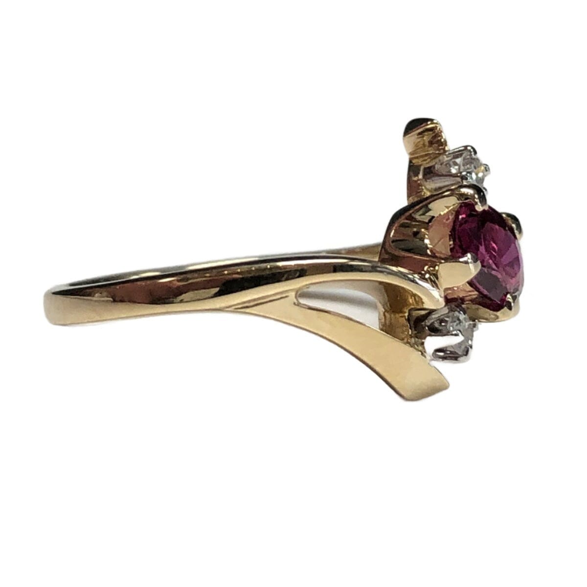 This 14k Gold Ruby & Diamond Ring is an incredibly pretty piece. It features an oval, cerise ruby with two sparkling diamonds set at diagonal points. The band itself is quite abstract in nature, making it very striking.