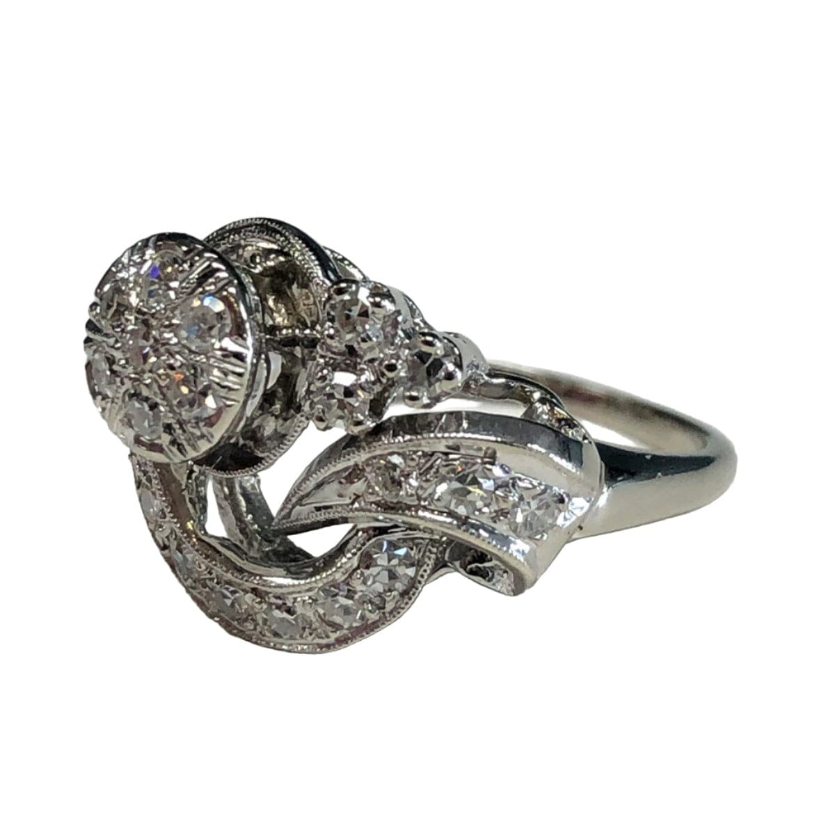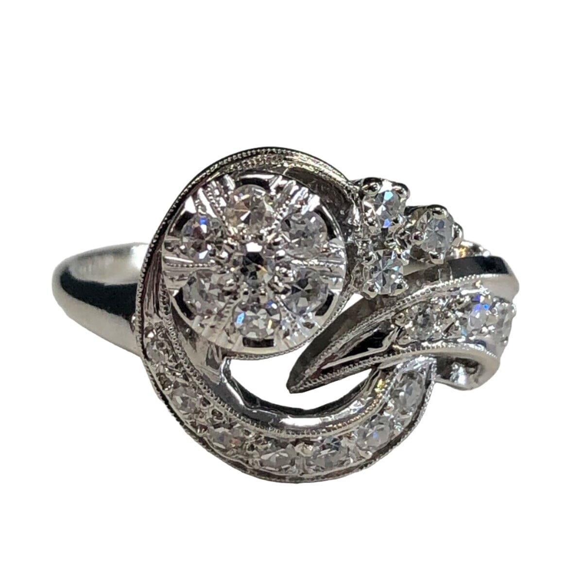 This 14k White Gold & Diamond Cocktail Ring is a lovely, stylish and quite unusual piece. The ring features lovely flowing lines that add a fabulous shape to this cocktail ring.