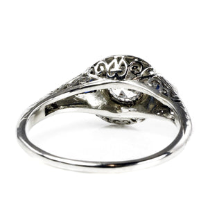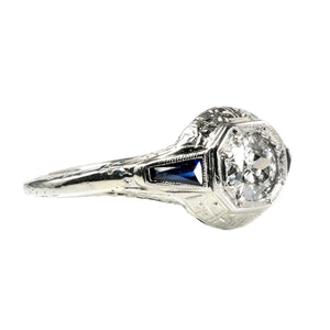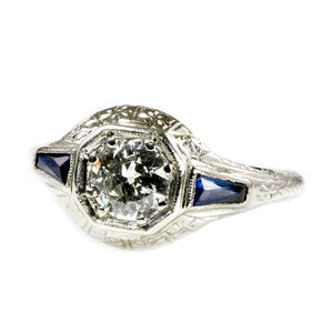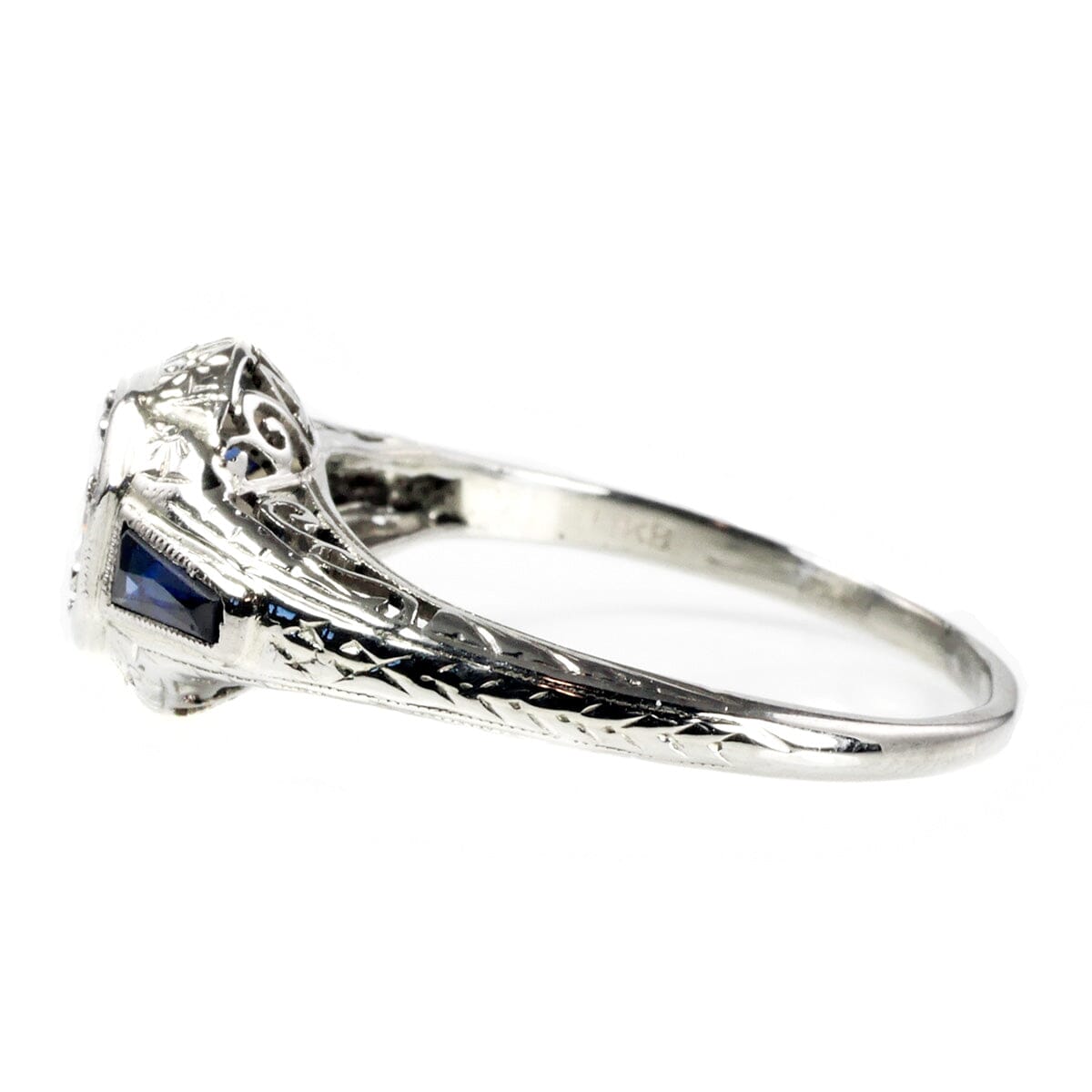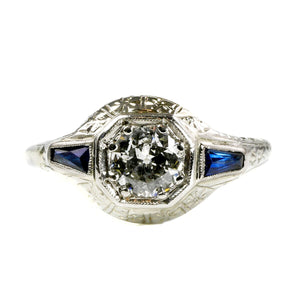This 18 k White Gold Diamond & Sapphire Art Deco Ring has a classic style. This ring is subtle enough for daily wear, allowing you to enjoy all the style ad grace of art deco in a everyday piece. The dazzling diamond is a 1/2 carat European cut.