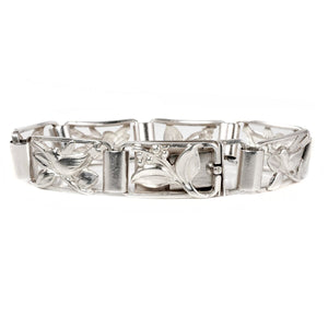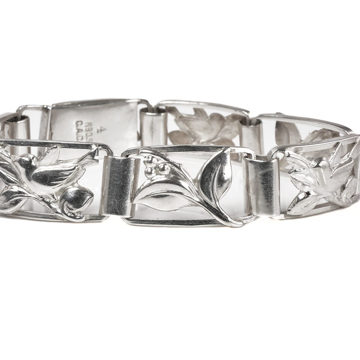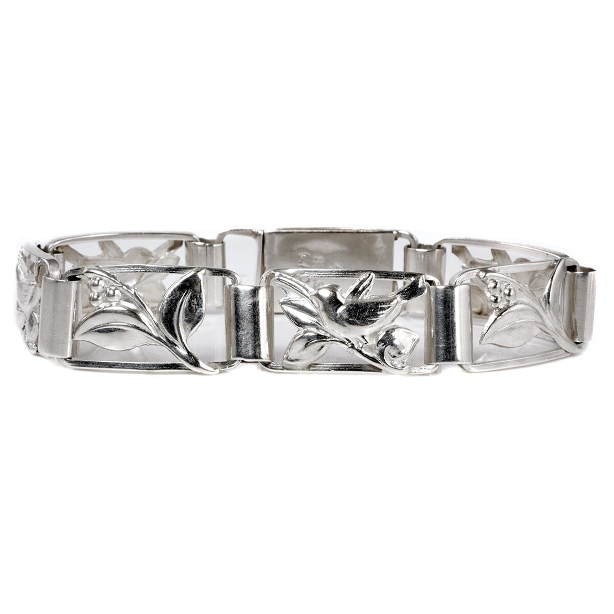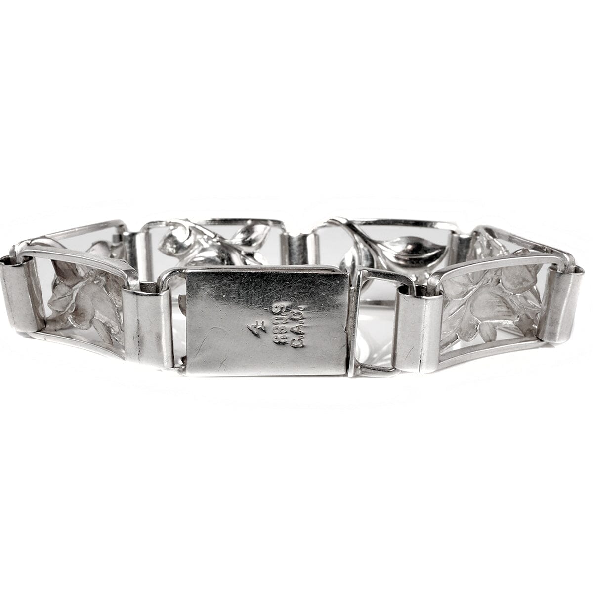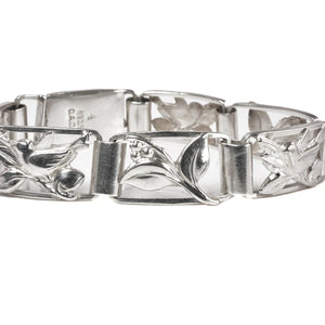 This vintage Silver Link Bracelet was designed and created by C.A. Christensen. Based out of Copenhagen this silversmith was active until 1973. It shows very typical Danish design, featuring raised floral and nature themed motifs on a simple silver link base,
