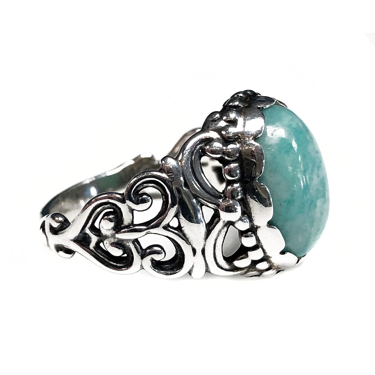 At its center is a striking oval amazonite gemstones, characterized by the teal coloring. Extending down either side of the ring is filigree inspired scrollwork in a substantial size. The ring has a strong boho chic vibe for the warmer months ahead.