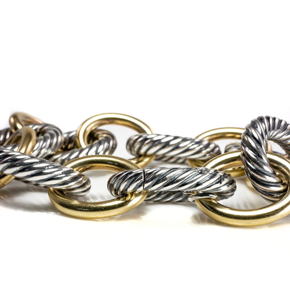 This David Yurman Oval Link Chain Bracelet is so on trend, bringing you a mix of sterling silver and 18 k gold. It features David Yurmans characteristic cable chain links, ensuring it will complement other Yurman pieces beautifully.