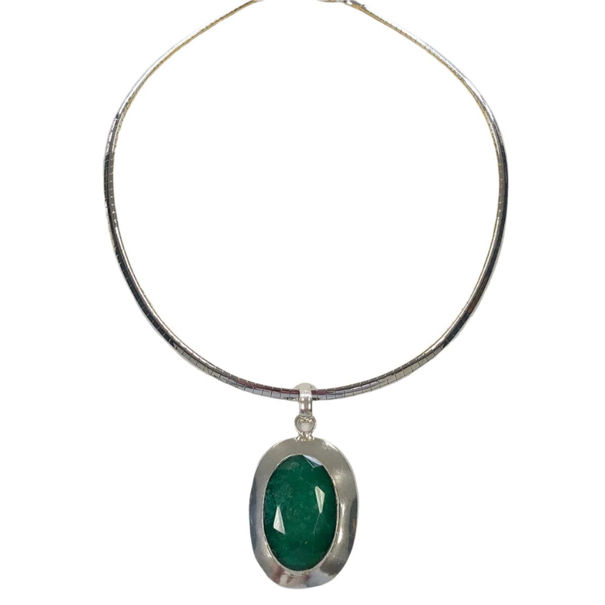 This Duo Tone Silver & Emerald Necklace has a lovely retro feel to it. The omega chain gives it quite a sleek look, finished with a large pendant housing an emerald gemstone.