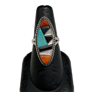 This Native American Silver & Gemstone Ring is a classical example of this style of design. A mix of mother of pearl, onyx, coral and turquoise stones are used in geometric cuts, to create the overall cat's eye shape. The stones are then braided in a traditional rope style design.