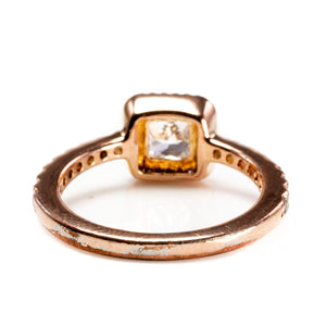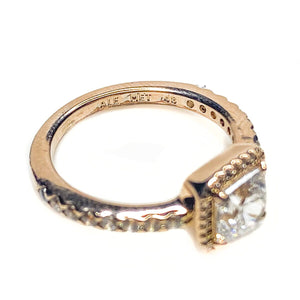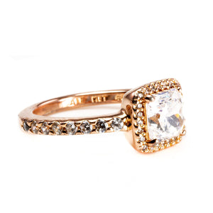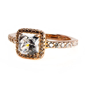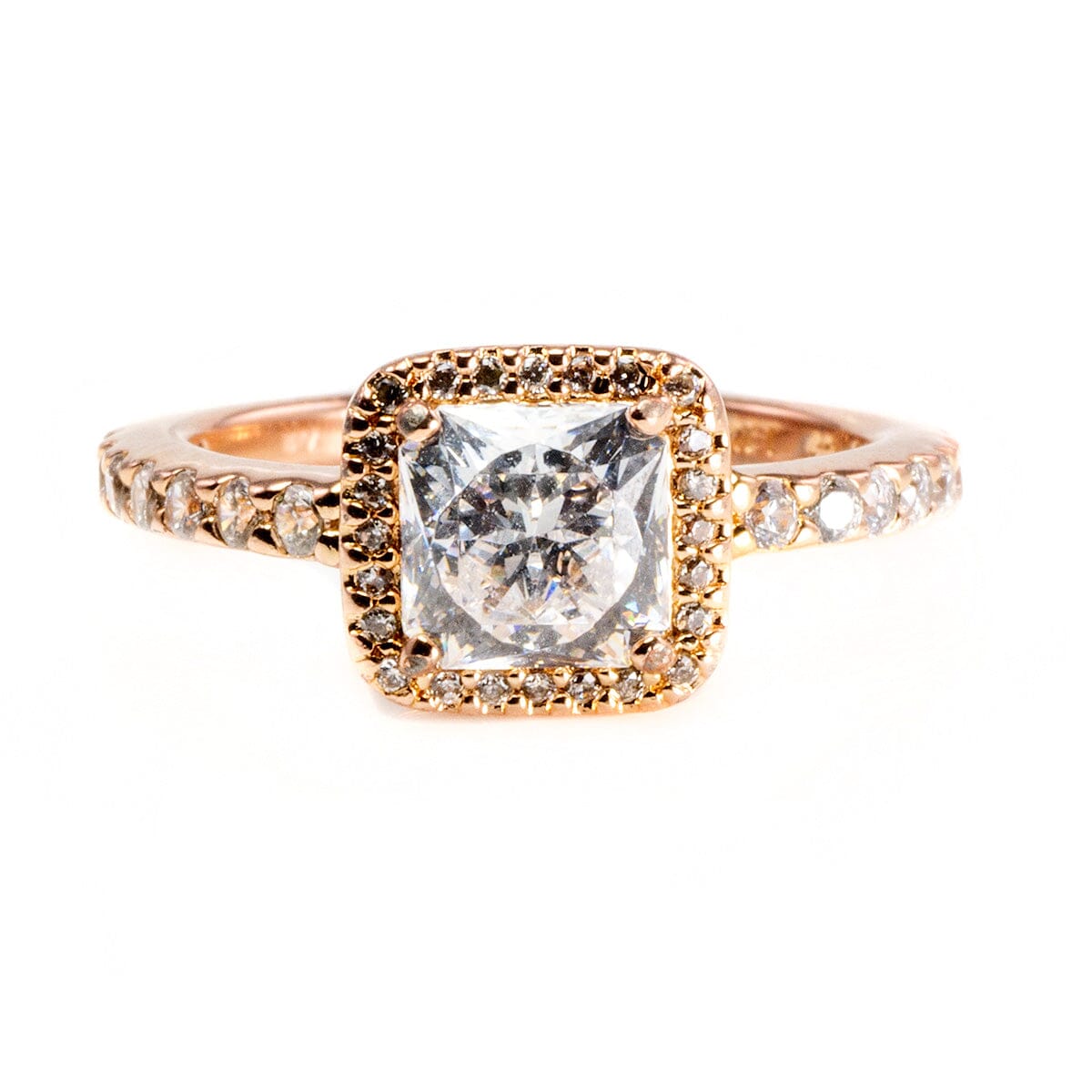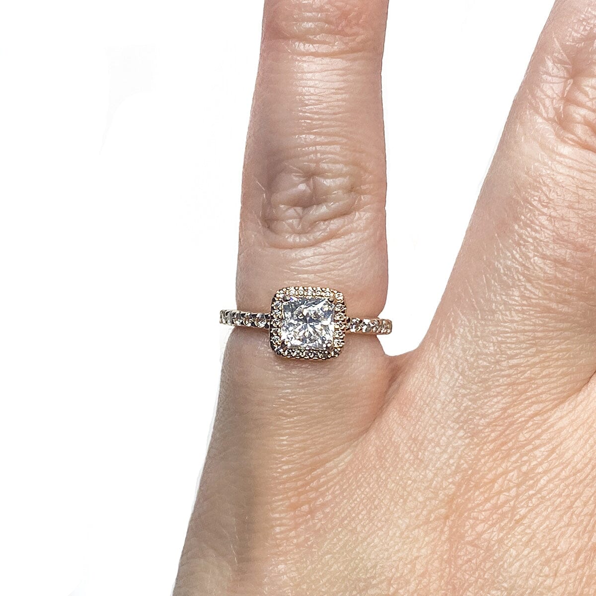 This Pandora Rose Halo Ring is a contemporary and chic feeling piece, ideal for everyday wear. This particular ring is rose gold plated over sterling silver. You can see small signs of wear at the very back of the band but this is nothing beyond everyday wear and is invisible when the ring is on the finger. At the heart of the ring is a square cubic zirconia with a halo setting. Despite the stone size, this ring is still slender enough to be incorporated into a multi ring or layered look.