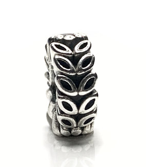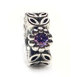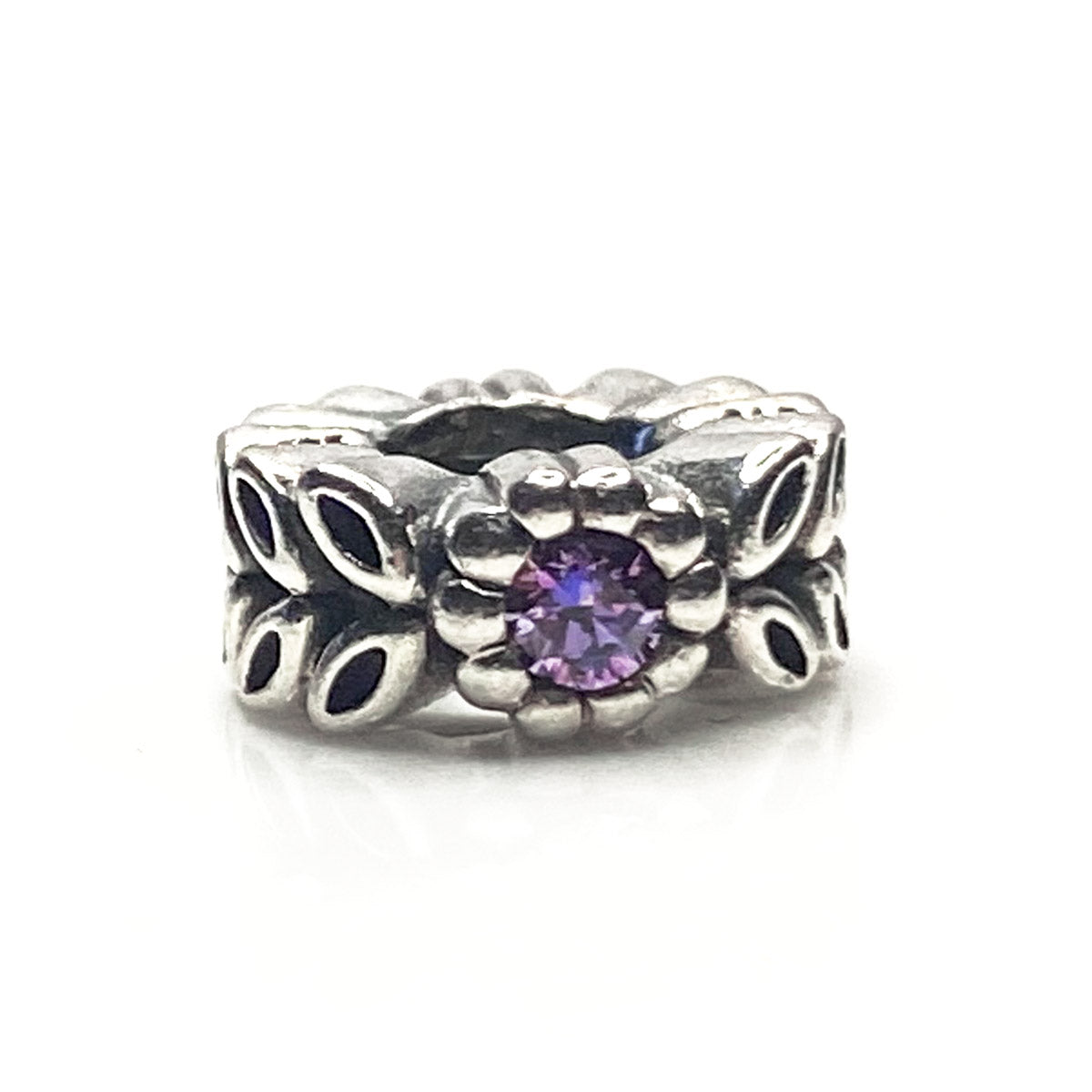 The Pandora Twice as Nice Spacers feature a leaf pattern around the edge and a focal floral motif with central CZ. It's a very pretty spacer, ideal for adding to floral and nature inspired bracelet.