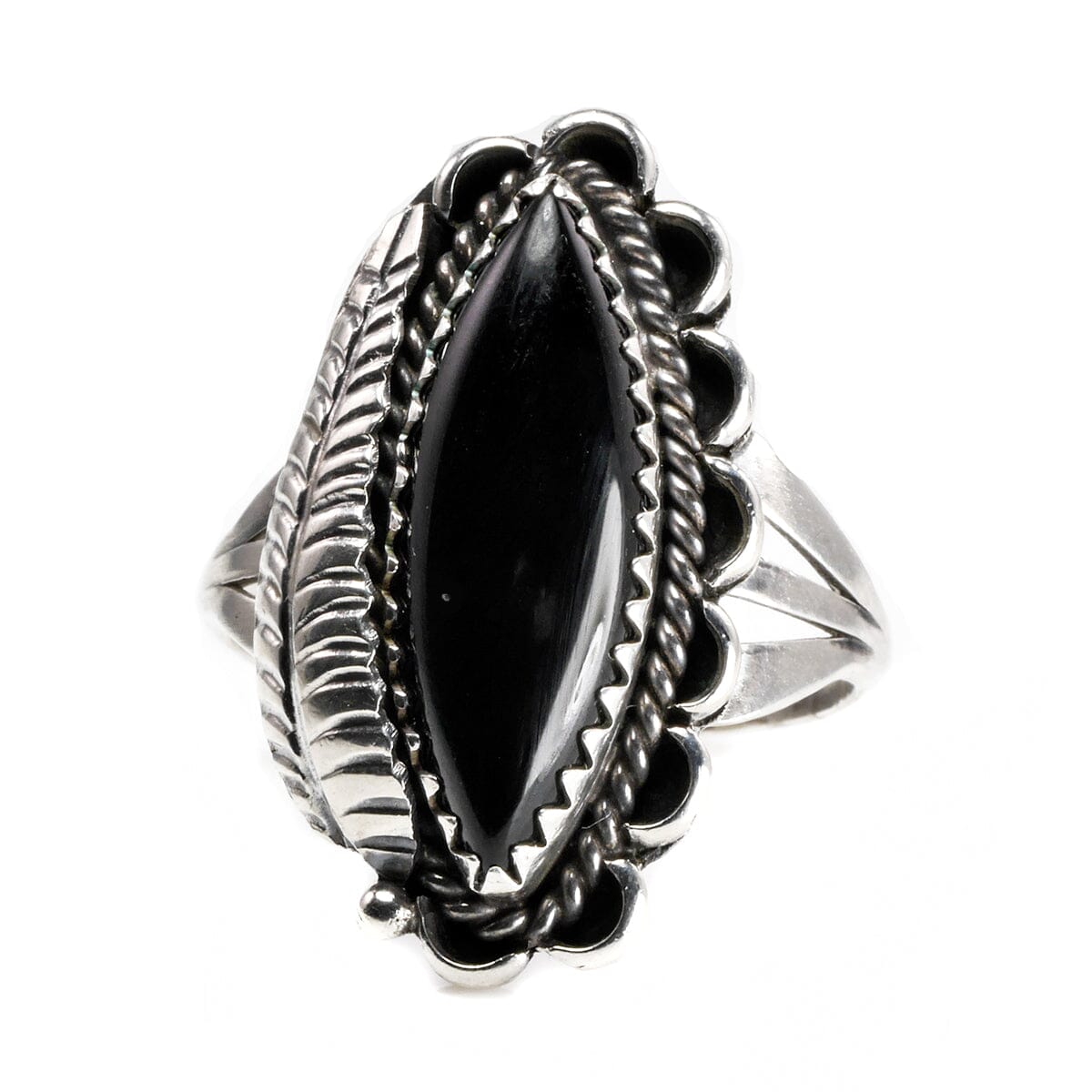 This Silver & Black Onyx Feather Ring has a slight gothic vibe to it which is so unusual! It features an elongated or cat's eye shape black onyx, framed half with a scalloped design and half with a detailed, elegant feather. If you're looking for something a little bit darker or edgier, this is ideal and its length will elongate your fingers too.