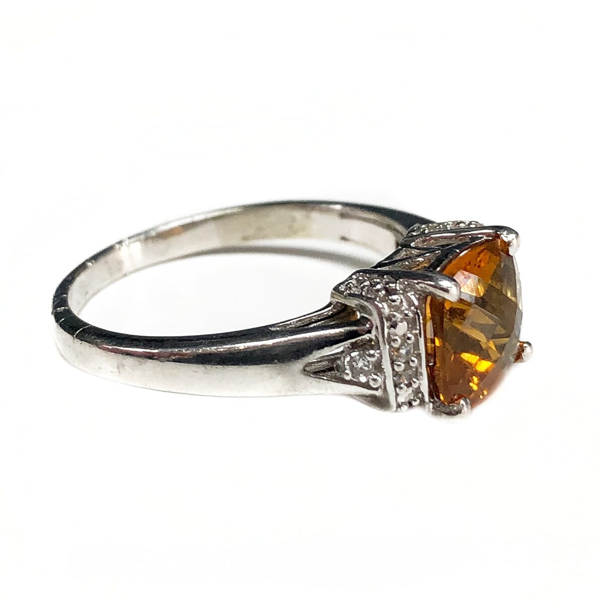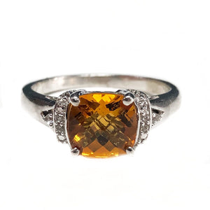 This Silver Citrine & White Sapphire Ring features a vibrant citrine gemstone at its center, complemented by a frame of dazzling white sapphires, creating a symphony of color and sparkle.
