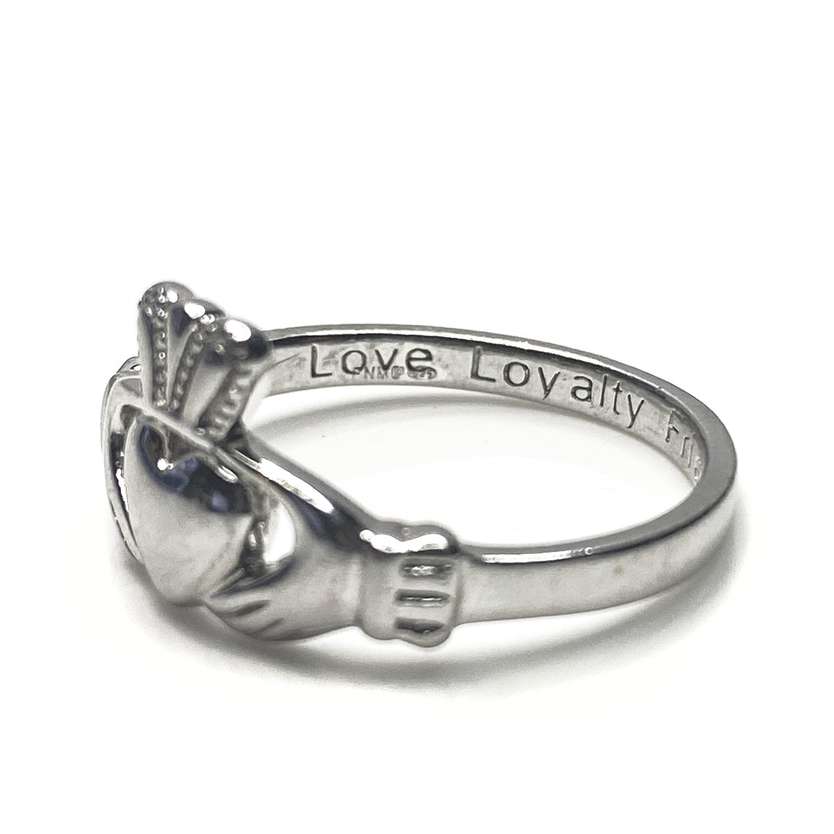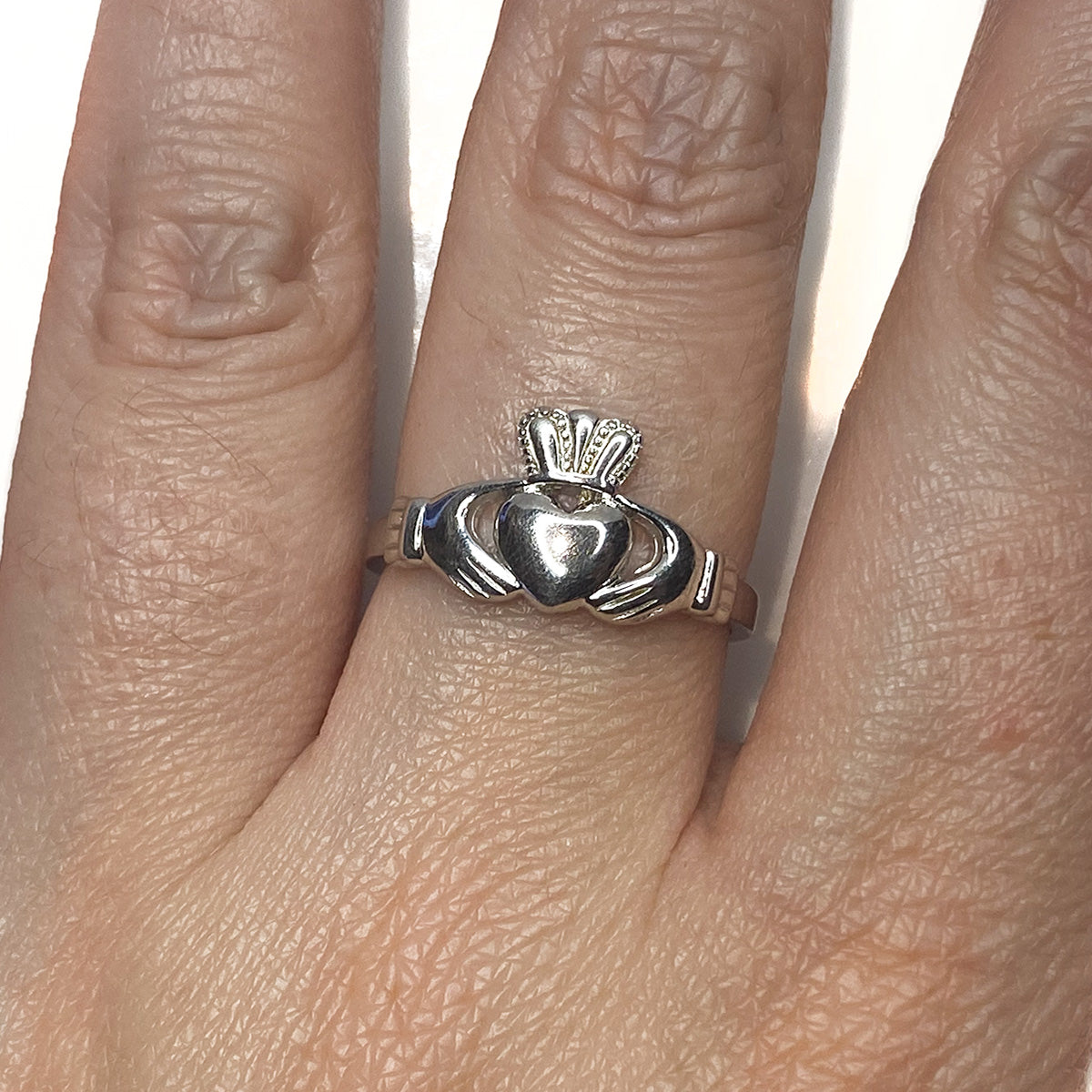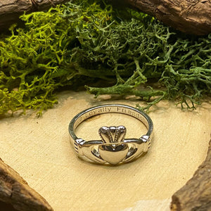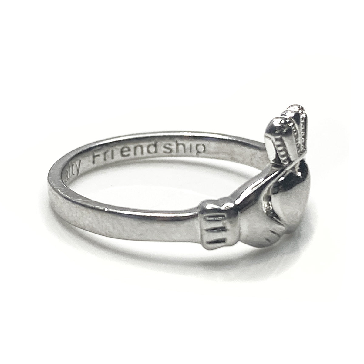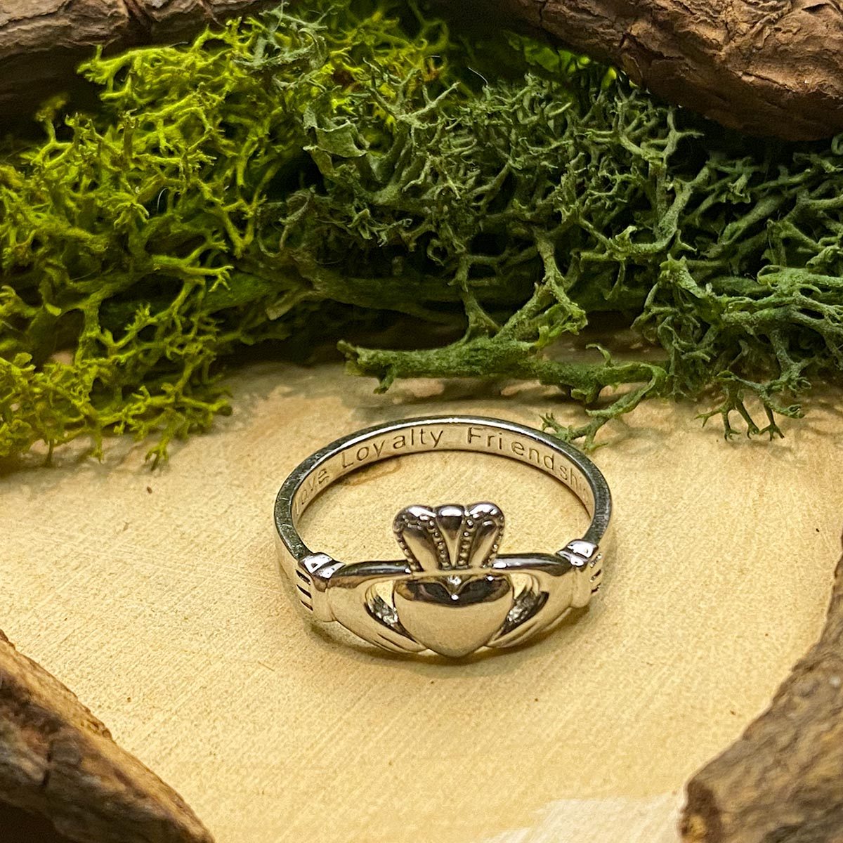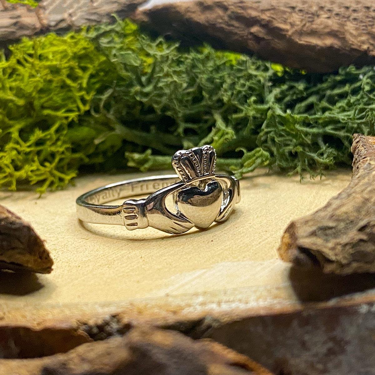 This Silver Claddagh Ring is an everyday essential and would make a heartfelt gift. The Claddagh is seeped in history and is worn to represent love, friendship and loyalty. As an extra attention to detail, this ring is engraved on the inside of the band with precisely those three words.