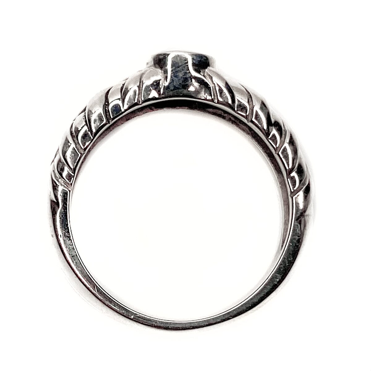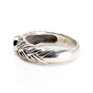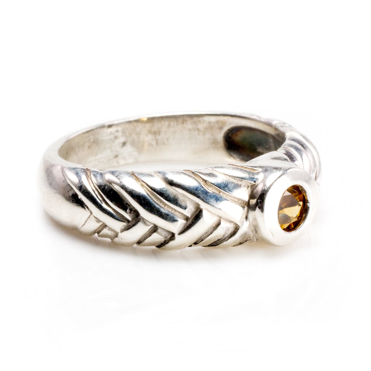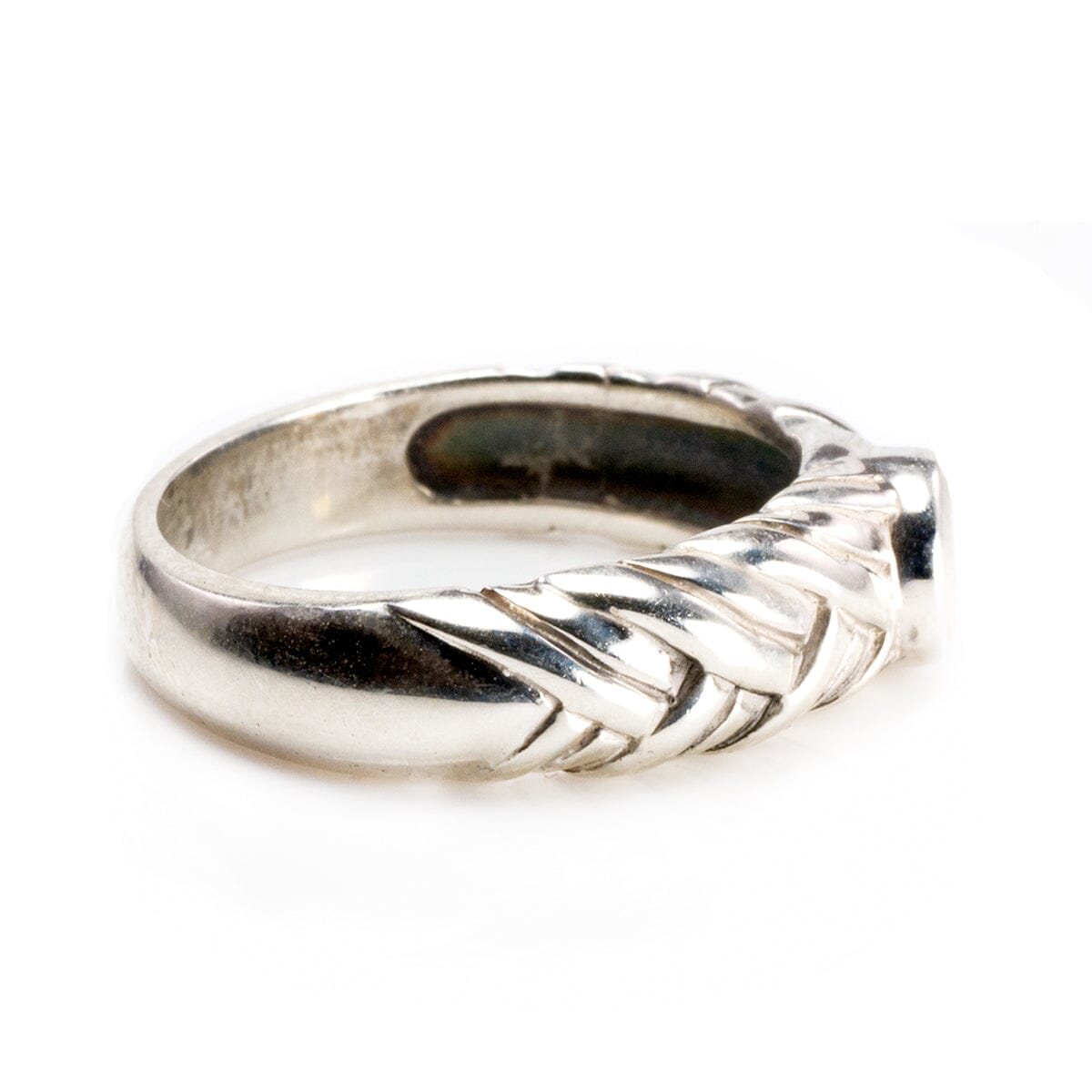This Silver & Cubic Zirconia Ring features a lovely, woven or braided silver band. This detailing extends half way around either side of the band before it switches to a clean, mirror like finish. It's a very nice ring with a subtle Celtic feel to it.