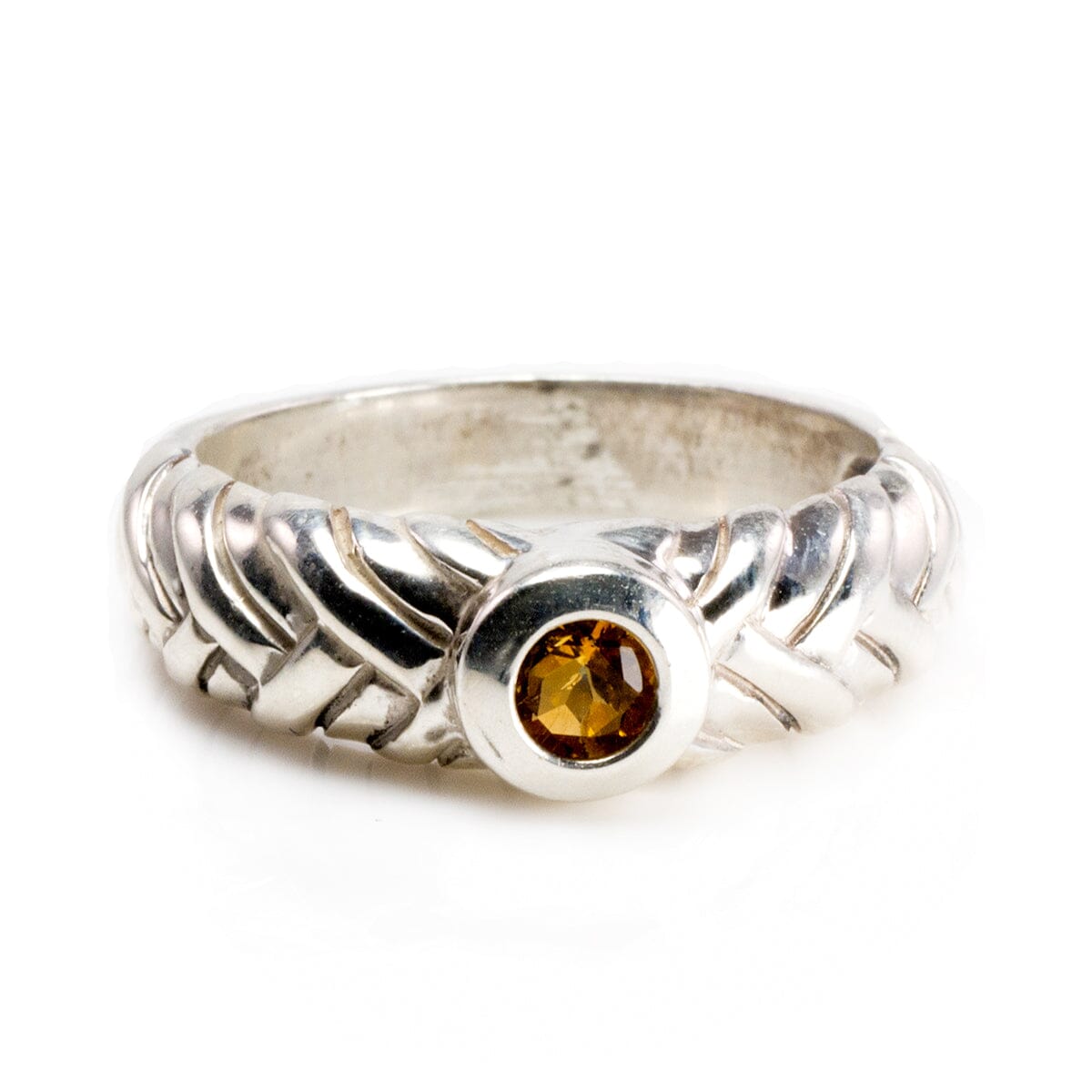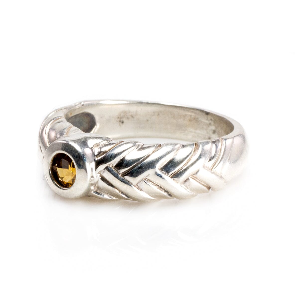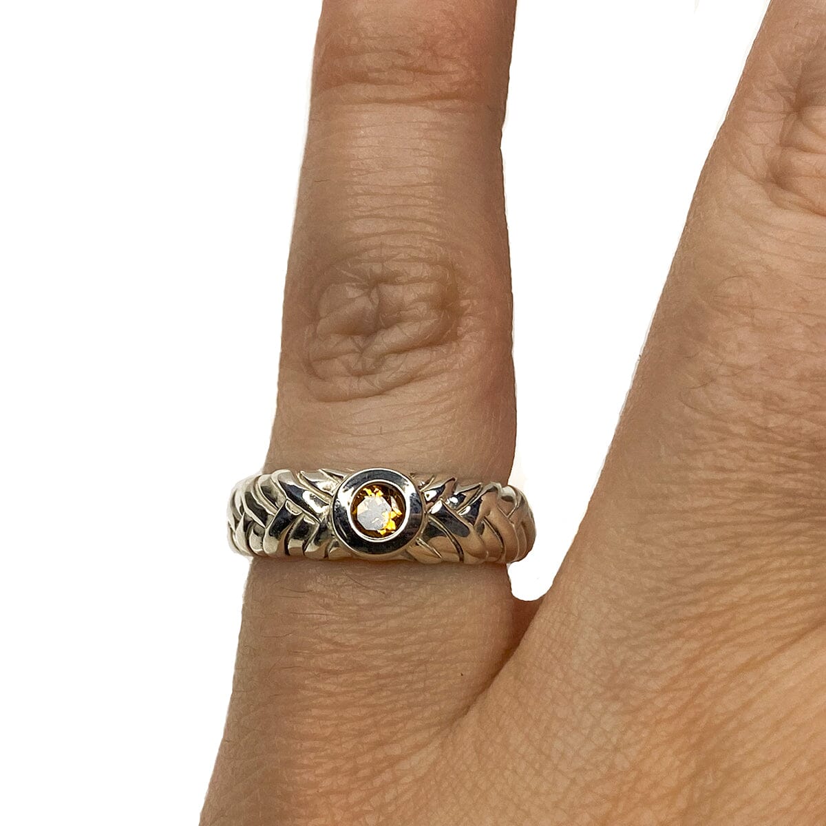 This Silver & Cubic Zirconia Ring features a lovely, woven or braided silver band. This detailing extends half way around either side of the band before it switches to a clean, mirror like finish. It's a very nice ring with a subtle Celtic feel to it.