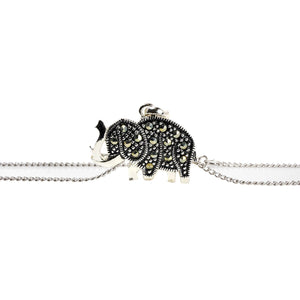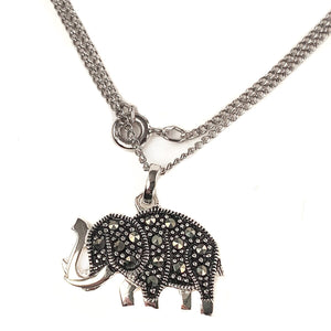 This Silver Elephant Necklace is a ready to wear (or gift) piece, featuring both the necklace and the pendant. The pendant itself is an elephant, fully accented across the front with marcasite gemstones in their characteristic metallic khaki green shade.